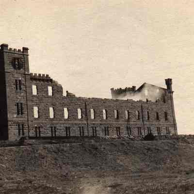One of a set of six. Clock Tower ofter explosion from South Side. B/W. Mounted.