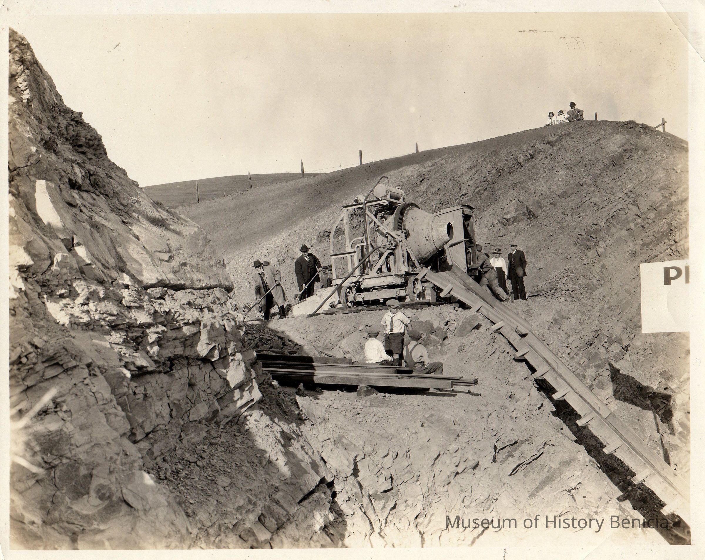 Two men in suits shoveling dirt into cement-mixer-like machine that empties into flume. Men, women and boys around. Photog. stamp on back. Carquinez Bridge construction?Collection