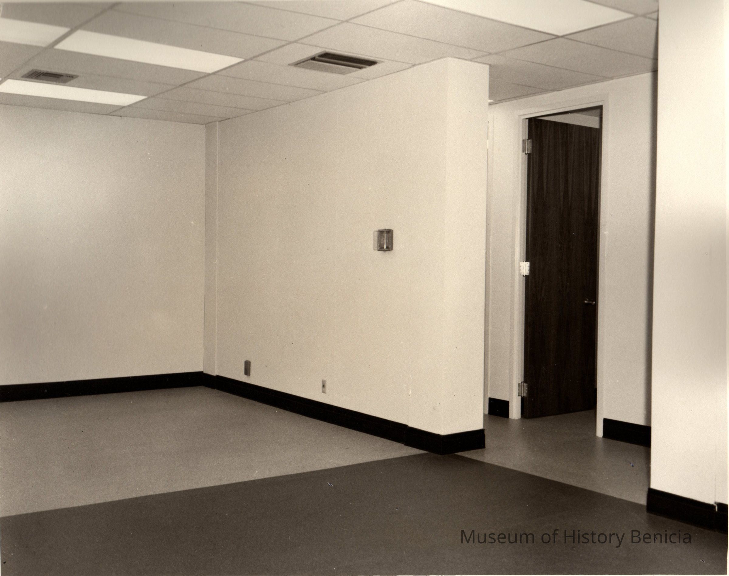 B/W photo of empty room, and hallway out of it, in Arsenal headquarters building.