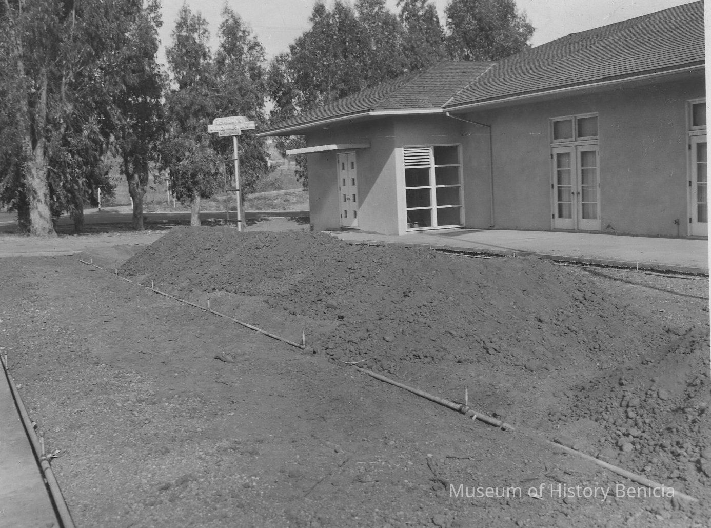 B/W photograph of new Veterans' Hall at First and East K Streets, built after WWII. Shows landscaping being installed (sprinkler system) in the front. A row of eucalyptus trees are in the background. They were removed when the library was built where East L Street used to run.Collection