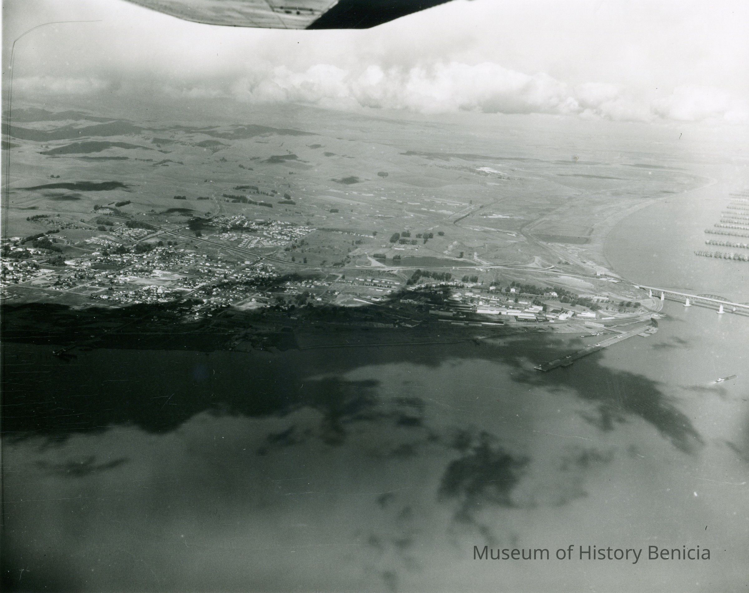 Black and white aerial view of Arsenal and Benicia from south.