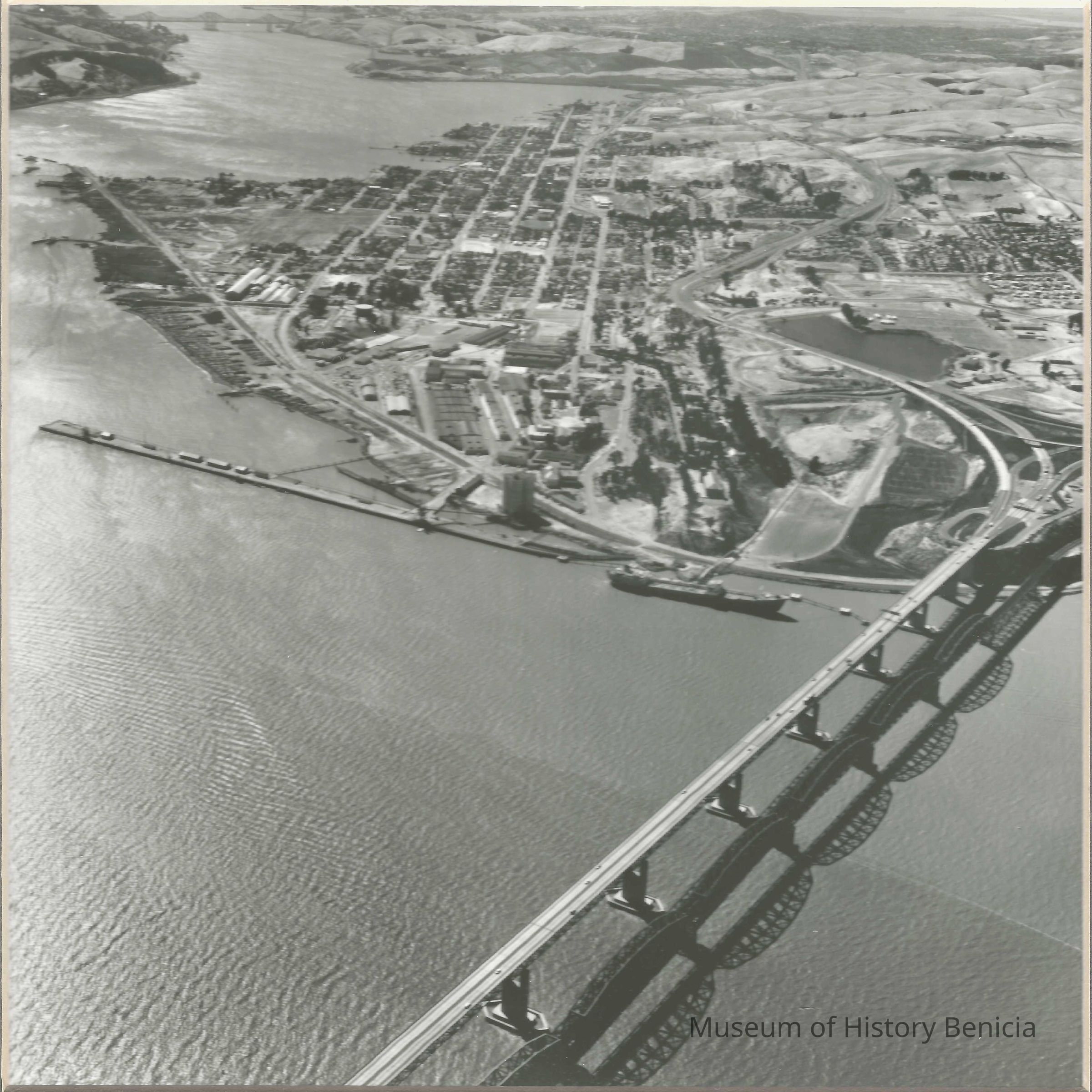 Benicia-Martinez Bridge air view also shows Benicia. Black and white photo.
