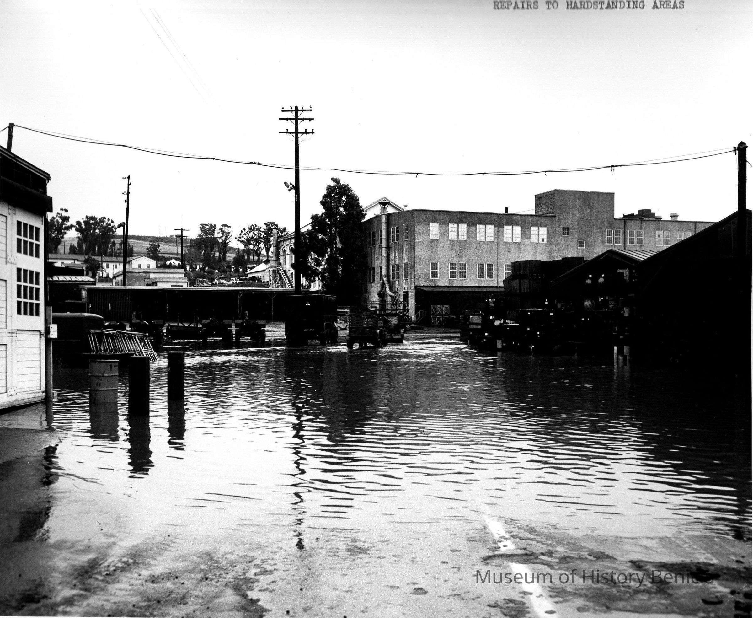 B/w Benicia Arsenal, repairs in the hardstanding areas. Shows Flooding in B.A.
