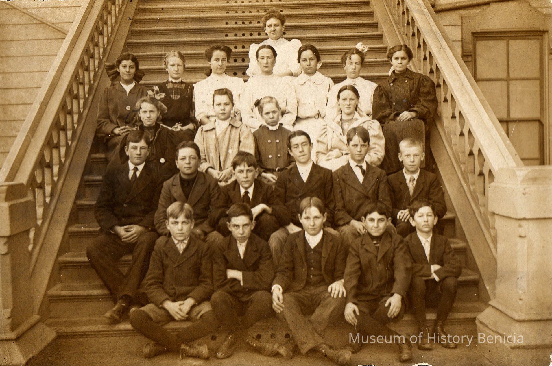 B/W photograph of Seventh grade class of Benicia Grammar School, 1907. Photo originally belonged to Albert Corcoran.