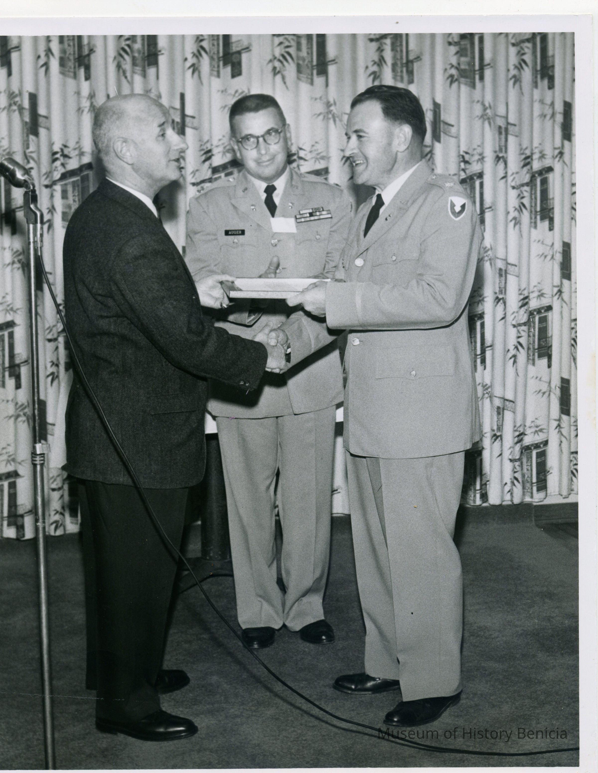 Colonel John P. Sherden, commander of the Benica Arsenal 1961-1962, presenting an award to Lt. Col. Verne M. Jensen, Execute Officer, Benicia Arsenal. Major Leonard Auger in center.Collection