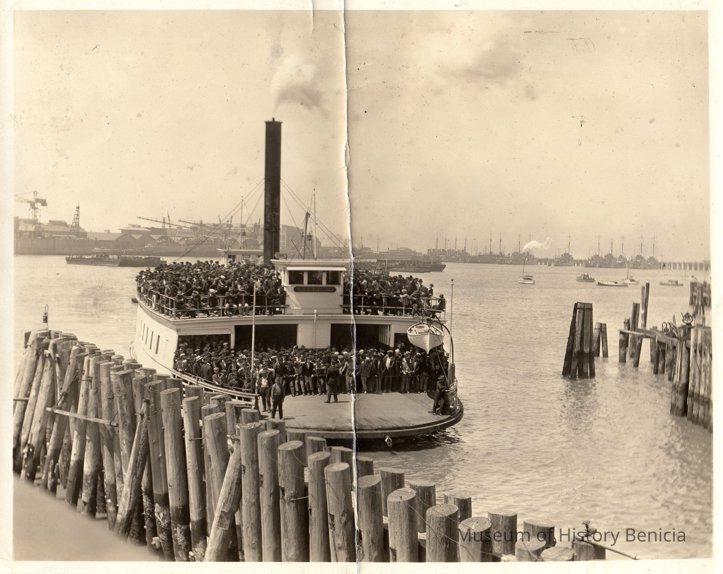 Ferryboat loaded with men coming up to dock. Mare Island in background. "Mare Island Ferry" on back in ink. Donor's father, Mr. Woodress, was a shareholder of the Carquinez Bridge (American Toll Bridge Co.). B/W photo.Collection