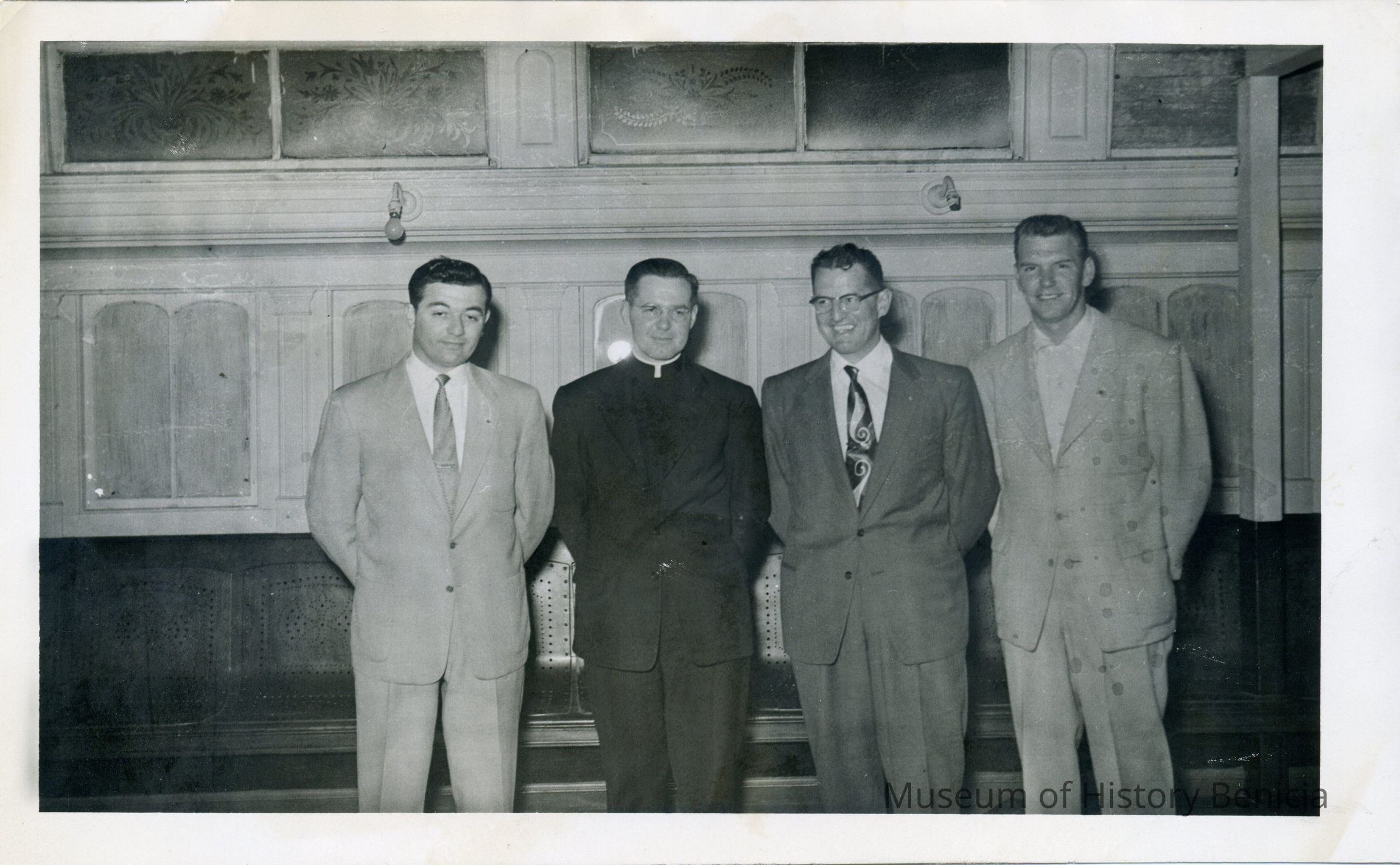 Four men stand by row of seats in Spenger's Restaurant. Left to right: Bill Francis; Fr. Walter Horan, O.P.; Edward Koenig; Cleo Hayes. Black and white photo.Collection