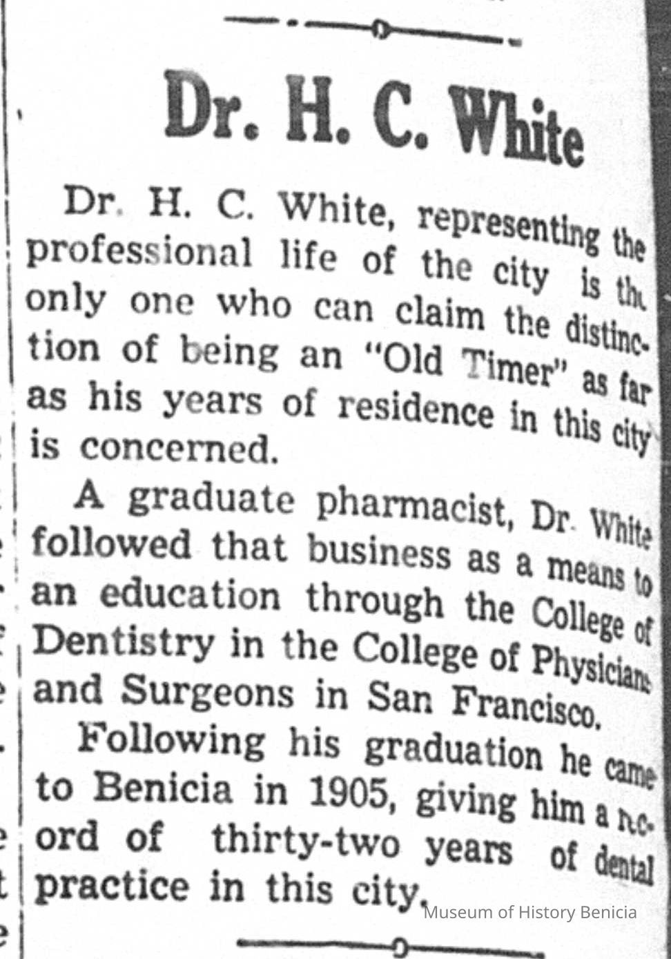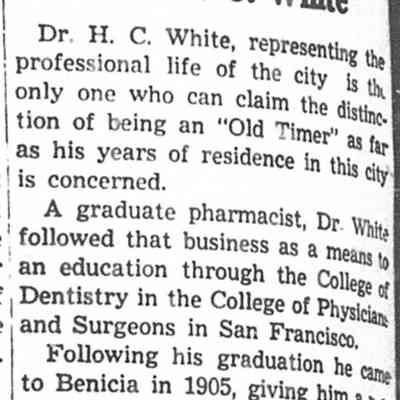A brief article from the 09/09/1937 Benicia Herald is attached which talks about Dr. White.Collection