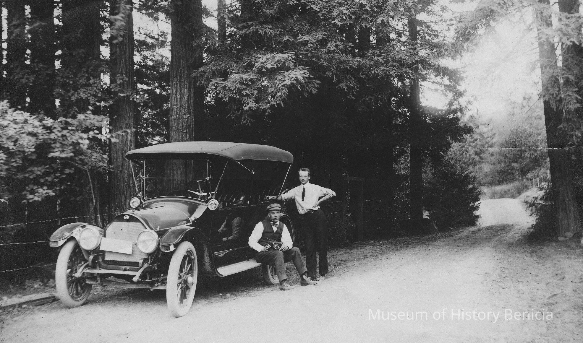 Dr. White, husband of Florence Anderson. (Other gentleman not identified.) The car looks like early Overland about 1912. B/W photo.