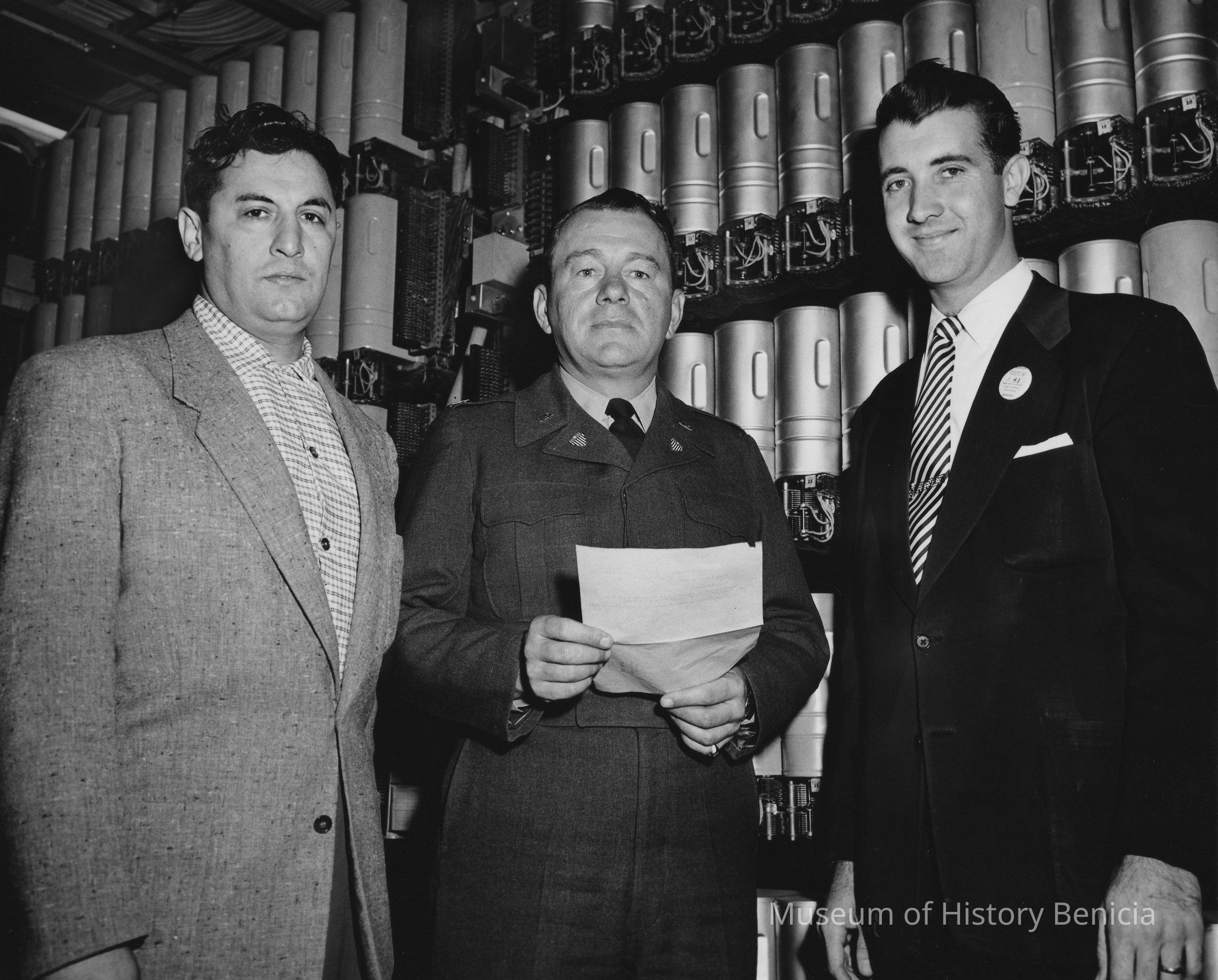 B/W Photograph: two men in suits; man in uniform in center, holding paper. On back: at far left, "Al Meeley"; U.S. Army photo stamp; and "04070-357-1 / AM-54".Collection