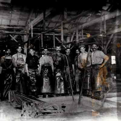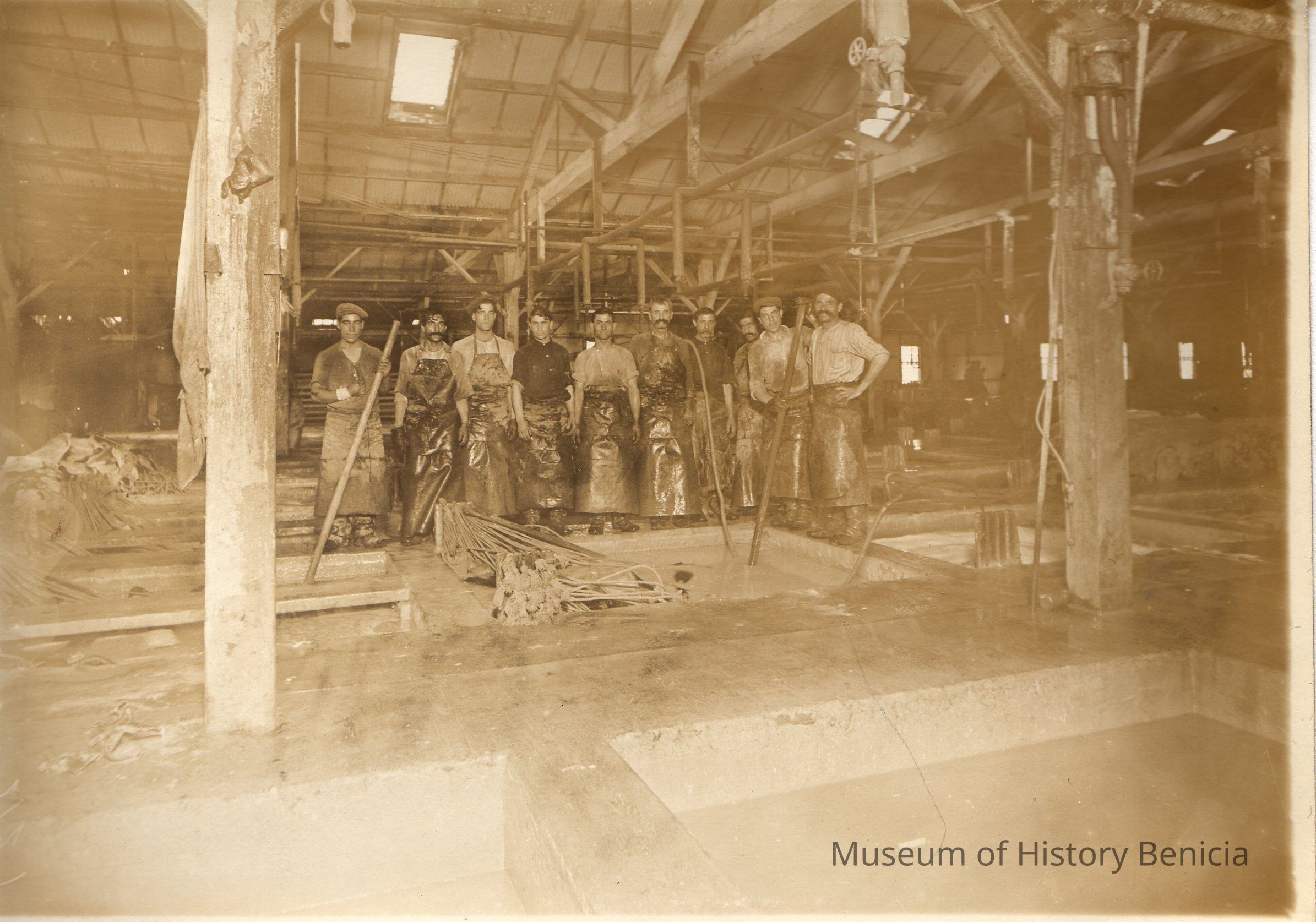 Sepia-tone photograph from an album: Kullman, Salz & Co. Tannery workers in the vat room.