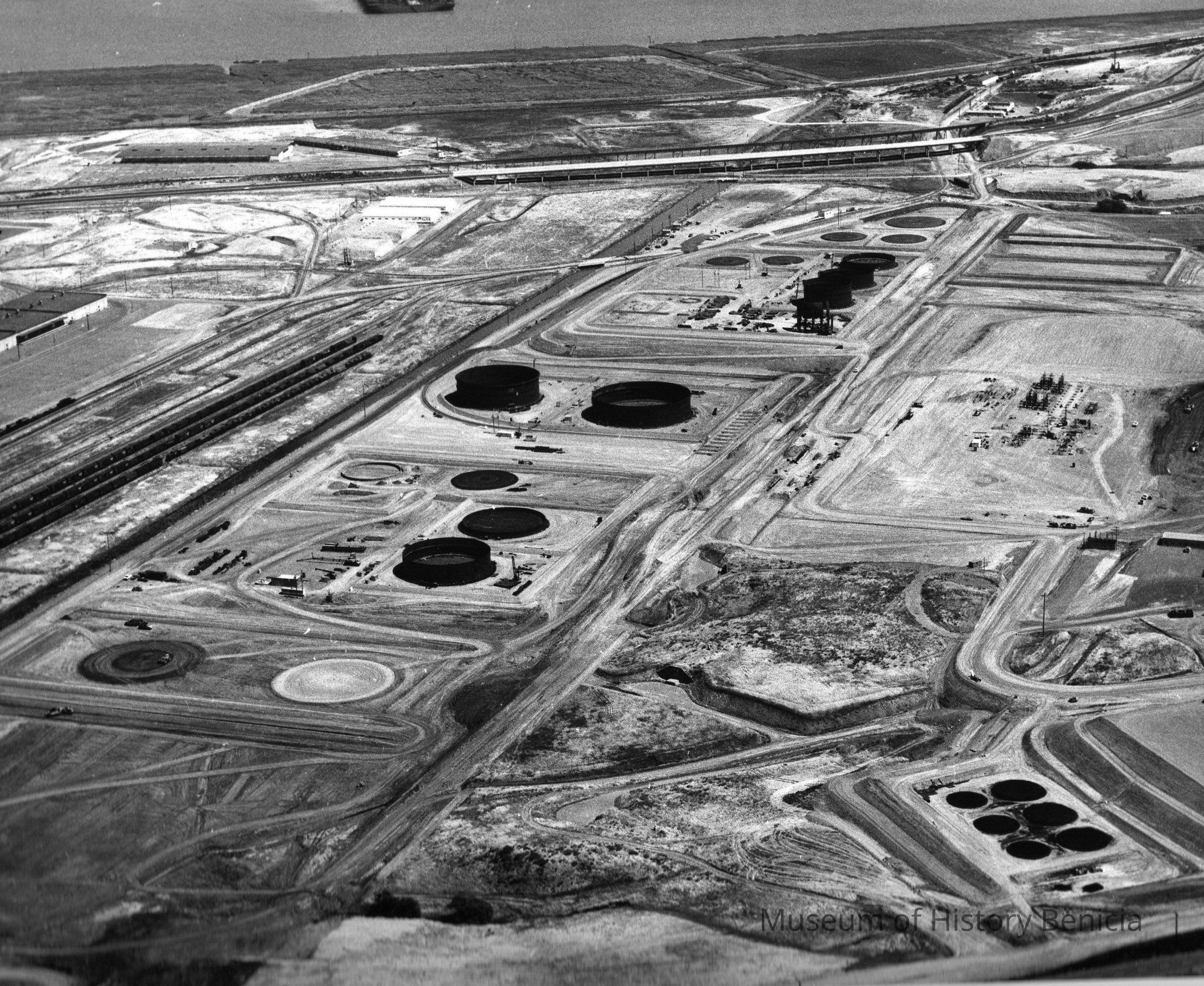B/W aerial photo of early construction of the Humble Oil Refinery (later Exxon & Valero) looking east; some Reserve (Mothball) Fleet ships at top of photo; 680 freeway viaduct slightly lower in the photo; concentration of partially completed storage tanks in center, along with graded pads and skeletons of other equipment and access roads.Collection