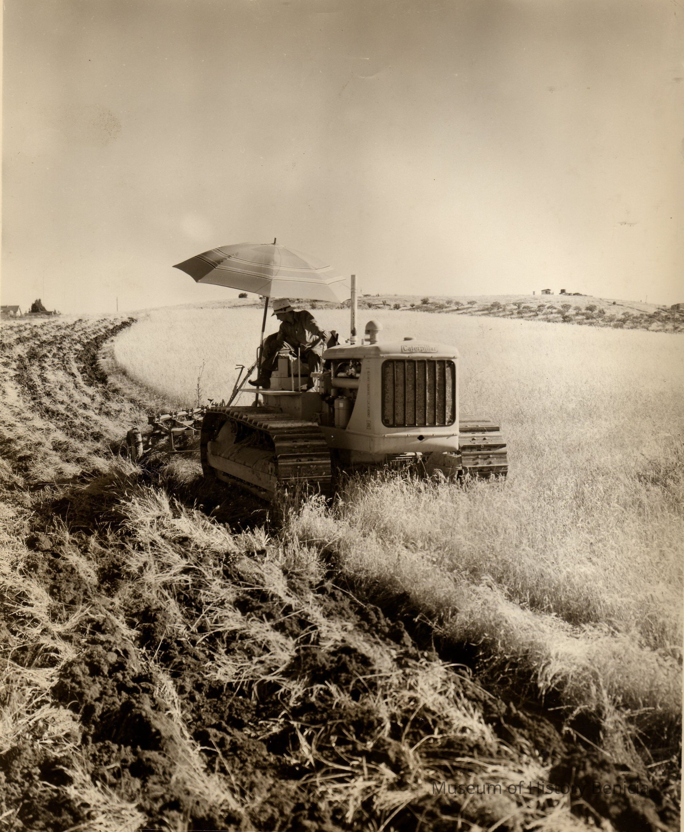B/W photo of man discing with tractor. Photographer's stamp on back, and circled "2" in pencil.