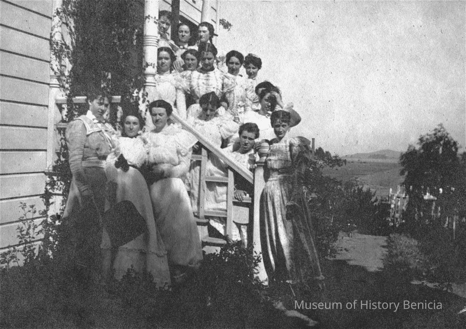 Photo from album page. Sixteen girls standing on a porch, stairs, and in a garden. Caption reads, "At Tillie Reed's, June 1898".Collection