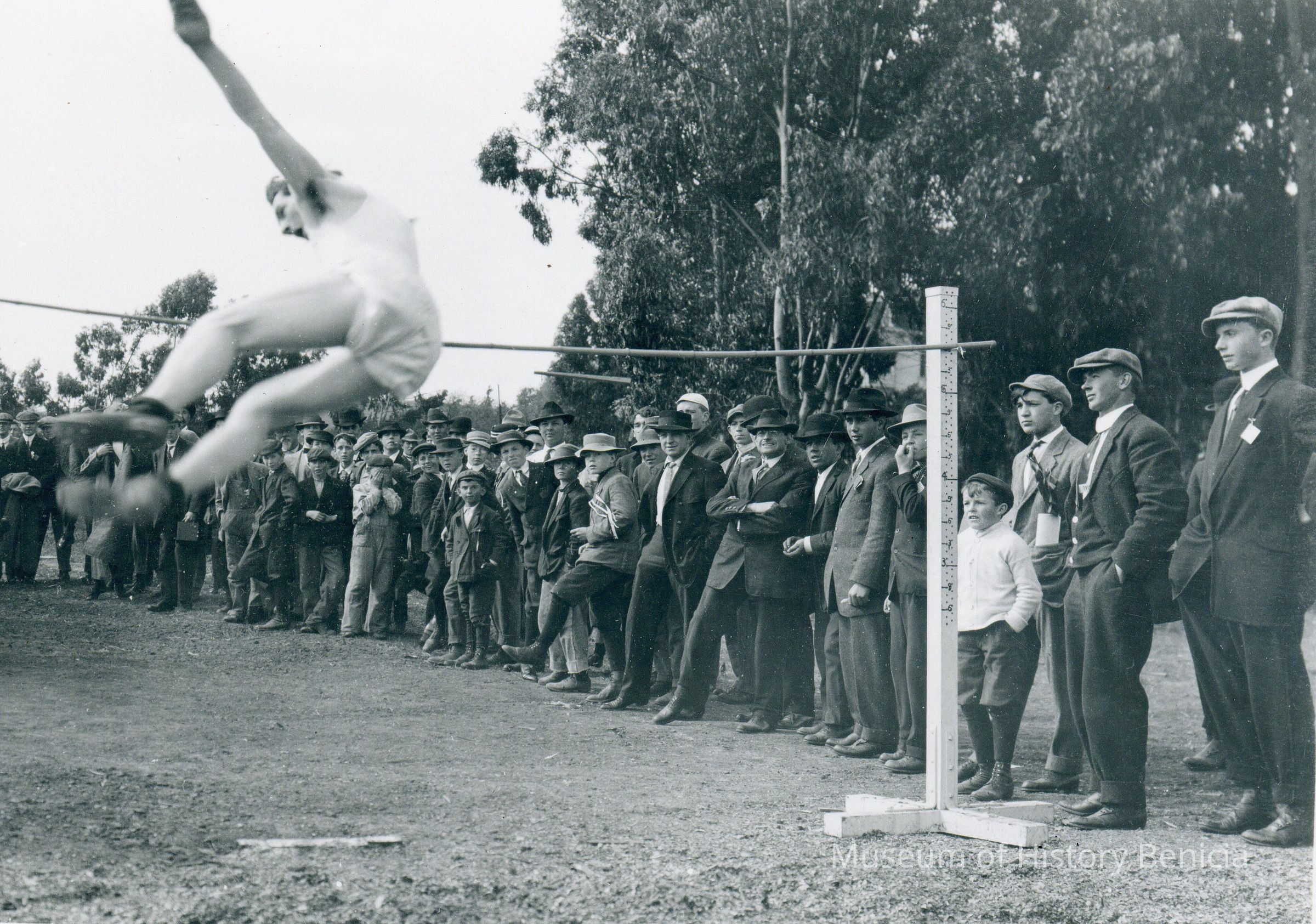 B/w photograph of a field meet with spectators watching an athlete jump over the High Jump.