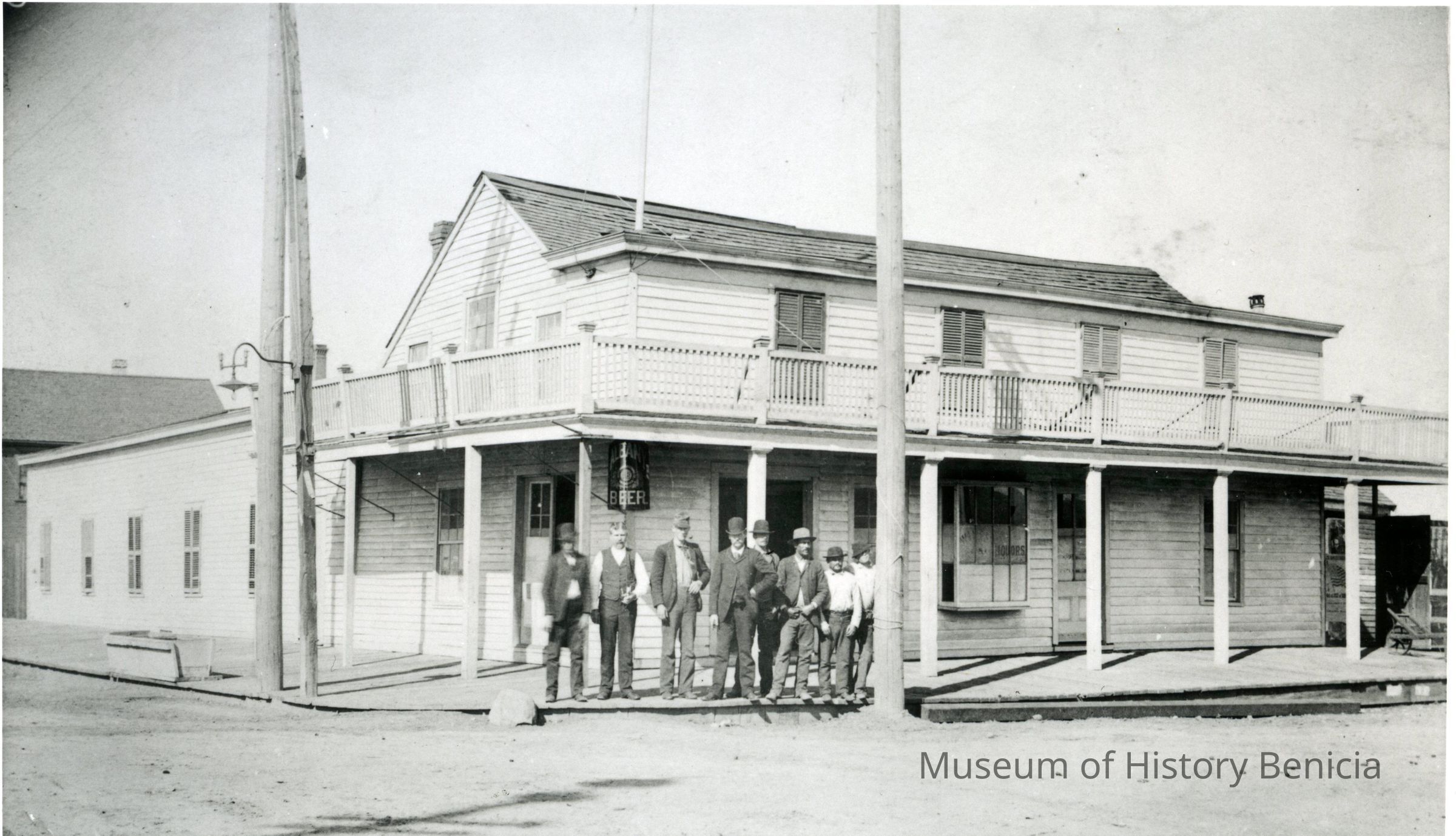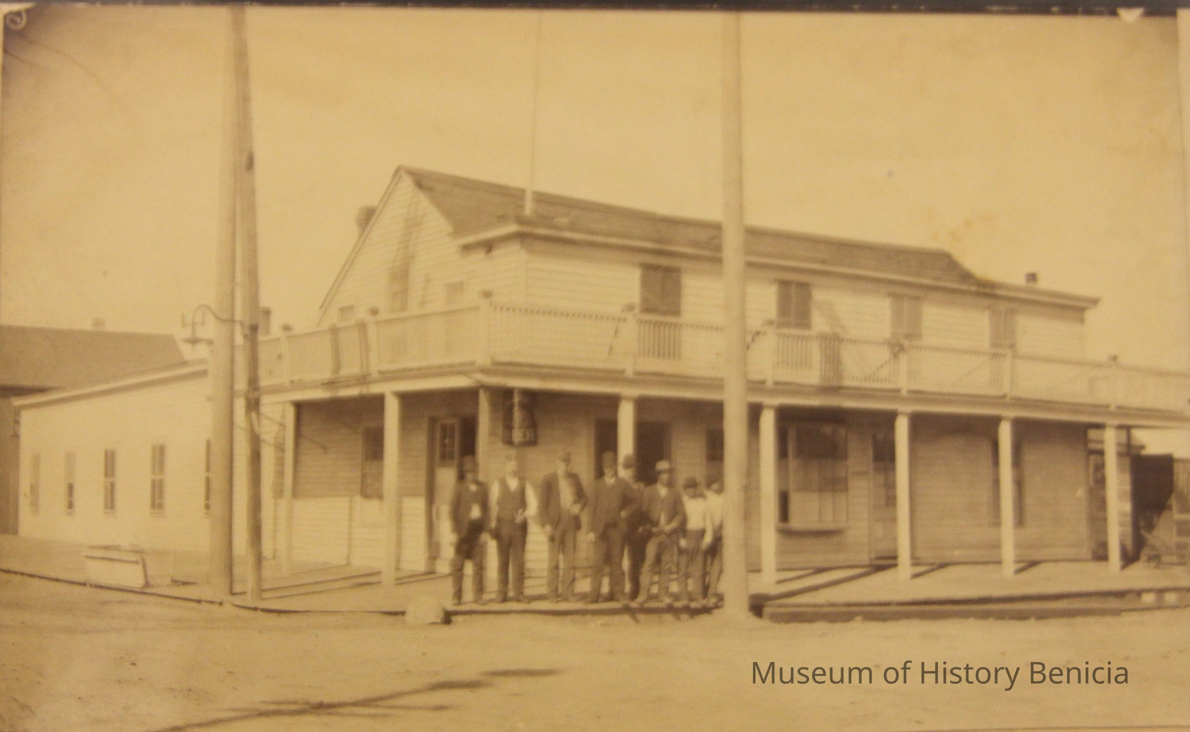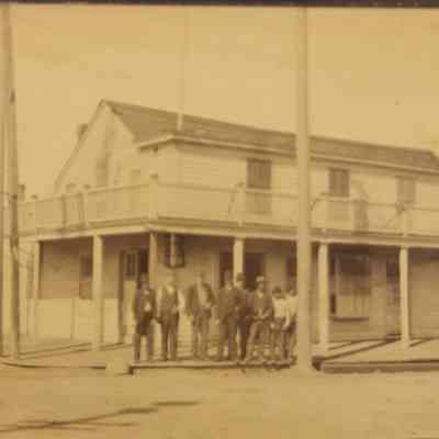 A copy of a photo from the California State Library Benicia collection. The photo shows Willard's Hotel with a group of people and dogs standing in front. The Willard Hotel was on the corner of First and A street in Benicia. It was very close to where the Jurgensen Saloon was later built. In fact, Jurgensen bought the 1 1/2 story hotel in 1889. He then either remodeled ther existing structure or built a new building on that spot circa 1902. The original owner was Joshua Willard but a later proprietor was Myrick Folsom.