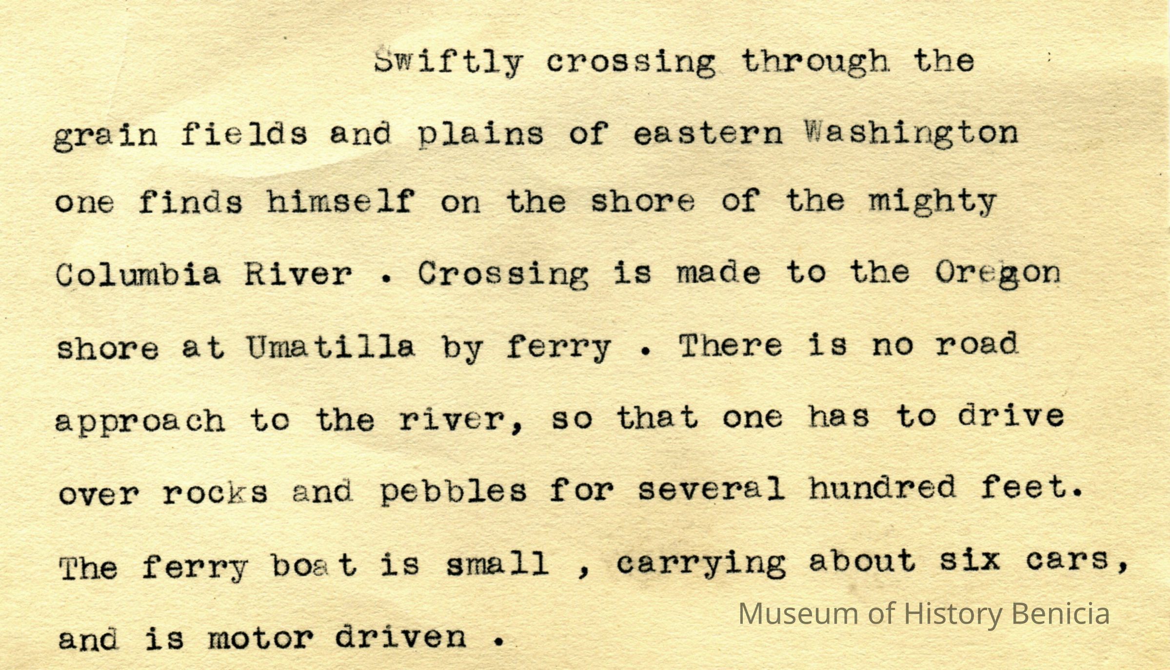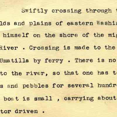There is typewritten note with the photo that describes the Umatilla ferry crossing. It says that the boat is very small and carries about six cars.Collection