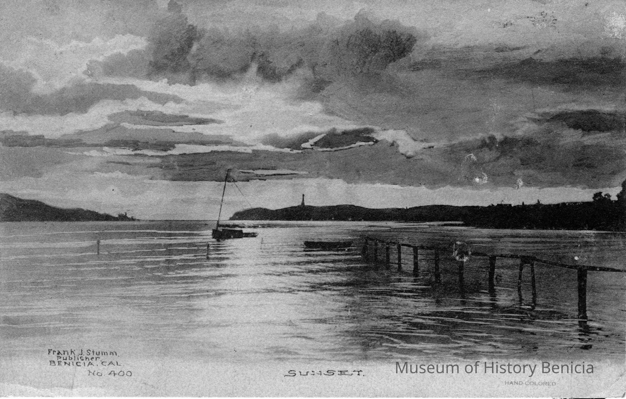 Photo of the Carquinez Strait of where the Carquinez bridge is now built. At the end of first street. Caption reads, "Benicia". Frank Strumm was the photographer. Some paper glued to the back.Collection