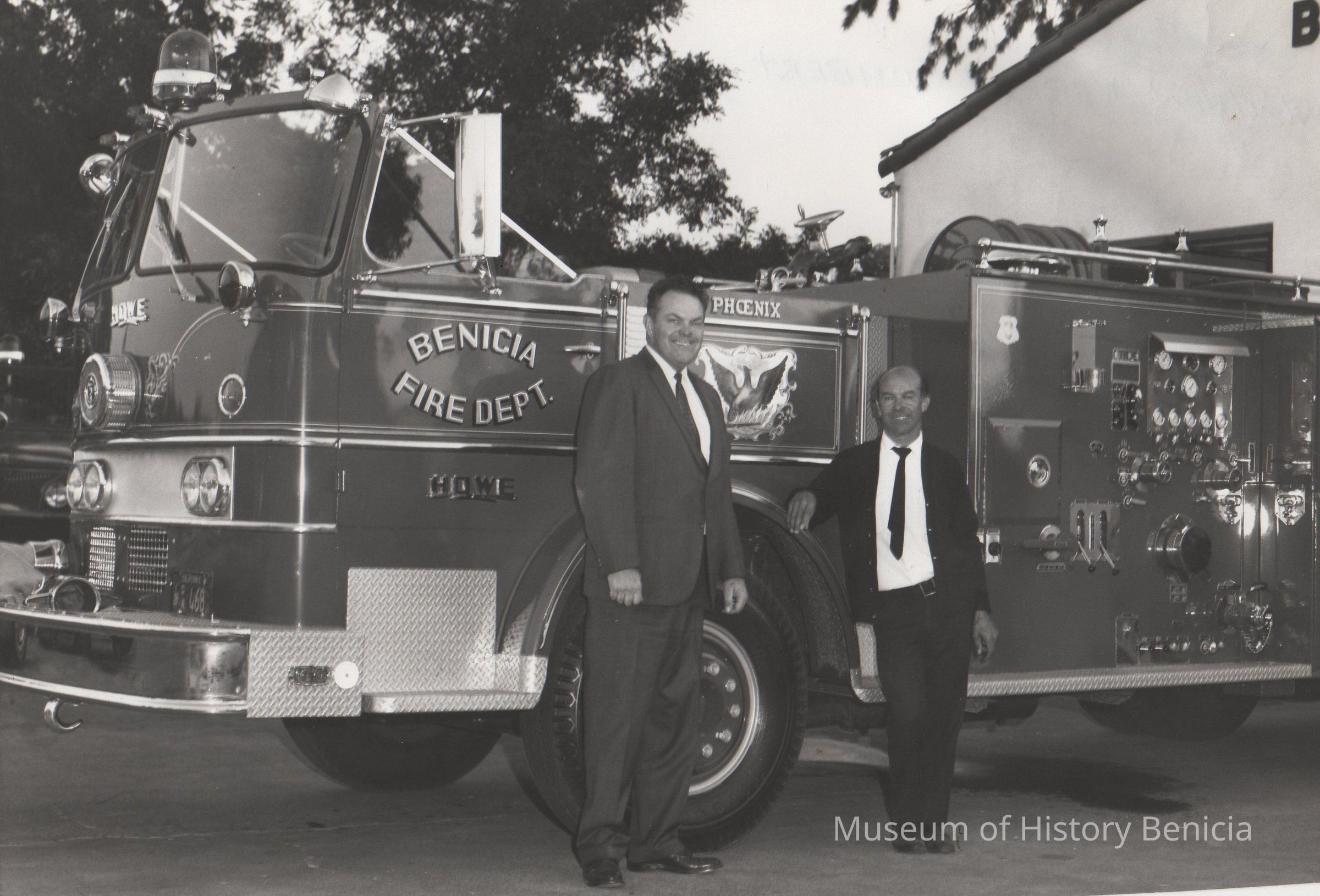 BW photograph: Councilman Warren Humbert and Fire Chief Tommy Gieffels. They are standing in front of a new firetruck, in tront of the fire house before its remodeling.Collection