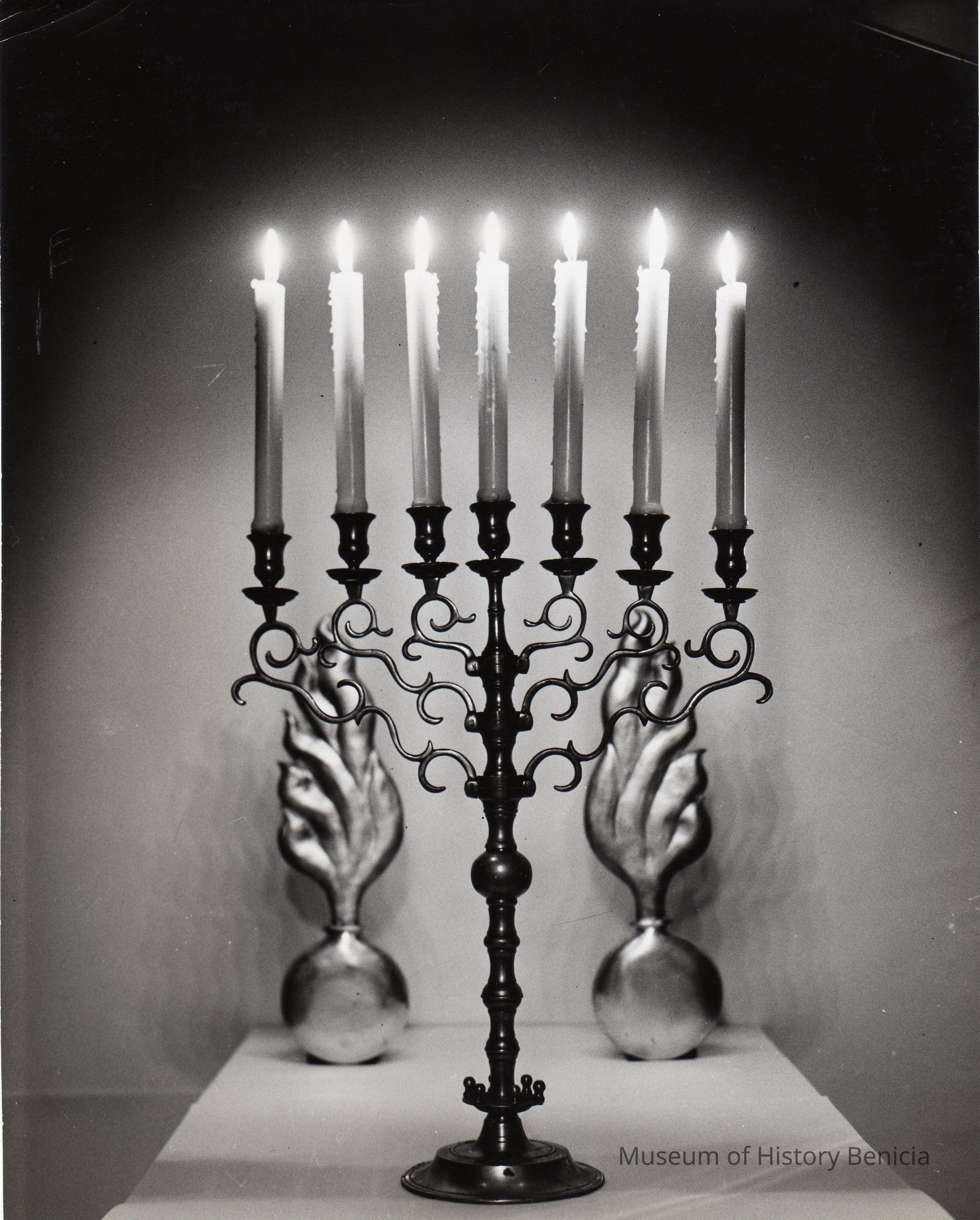 B/W An image of an iron candlelabra with flaming canon balls (symbol of the Benicia Arsenal) on each side. On the back is written "Christmas Card 1946"Collection