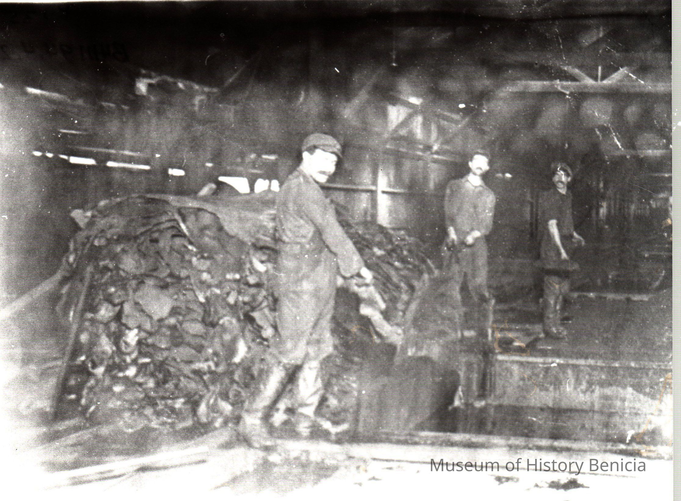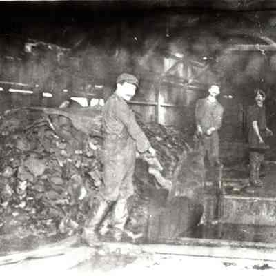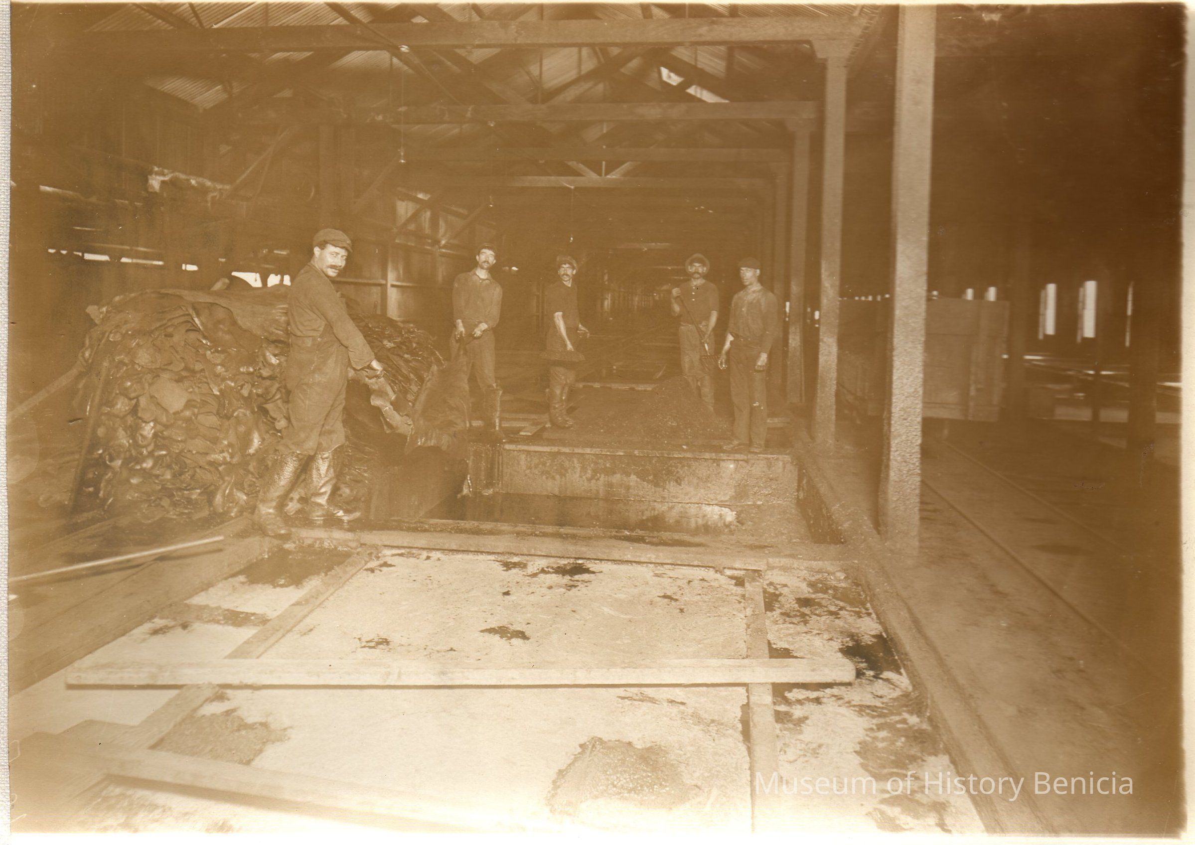 Sepia-tone photograph from an album: Kullman Salz Tannery workers loading tan bark into tanning vats.