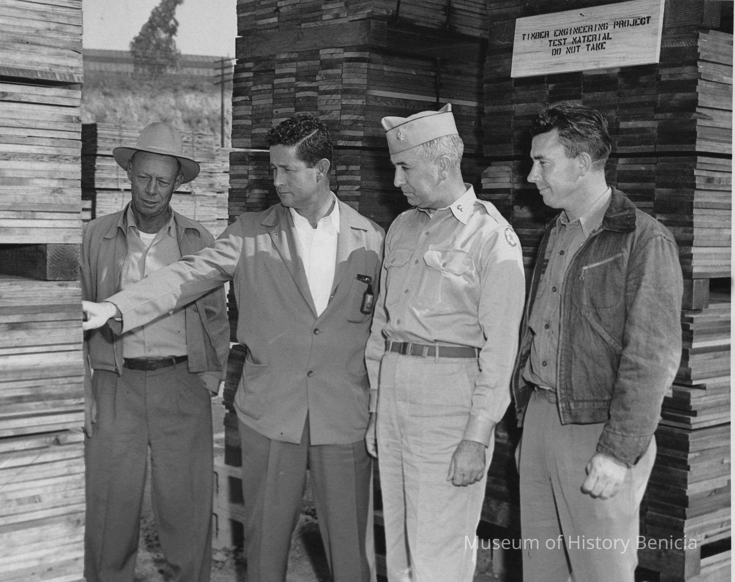 B/W Photograph: four men surrounded by piles of lumber with a sign reading: "Timber Engineering Project Test Material / Do Not Take". One man is pointing to some lumber while the others look on. On back: "#1" in pencil and U.S. Army photo stamp.Collection