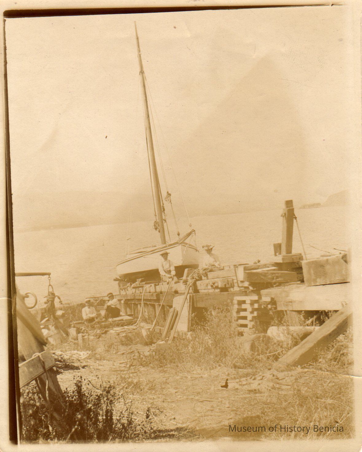 Sepia toned photograph of a ship in the Benicia shipyard.