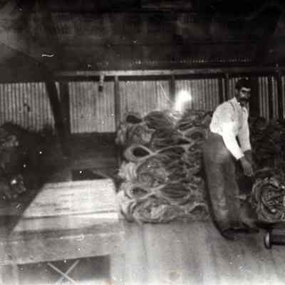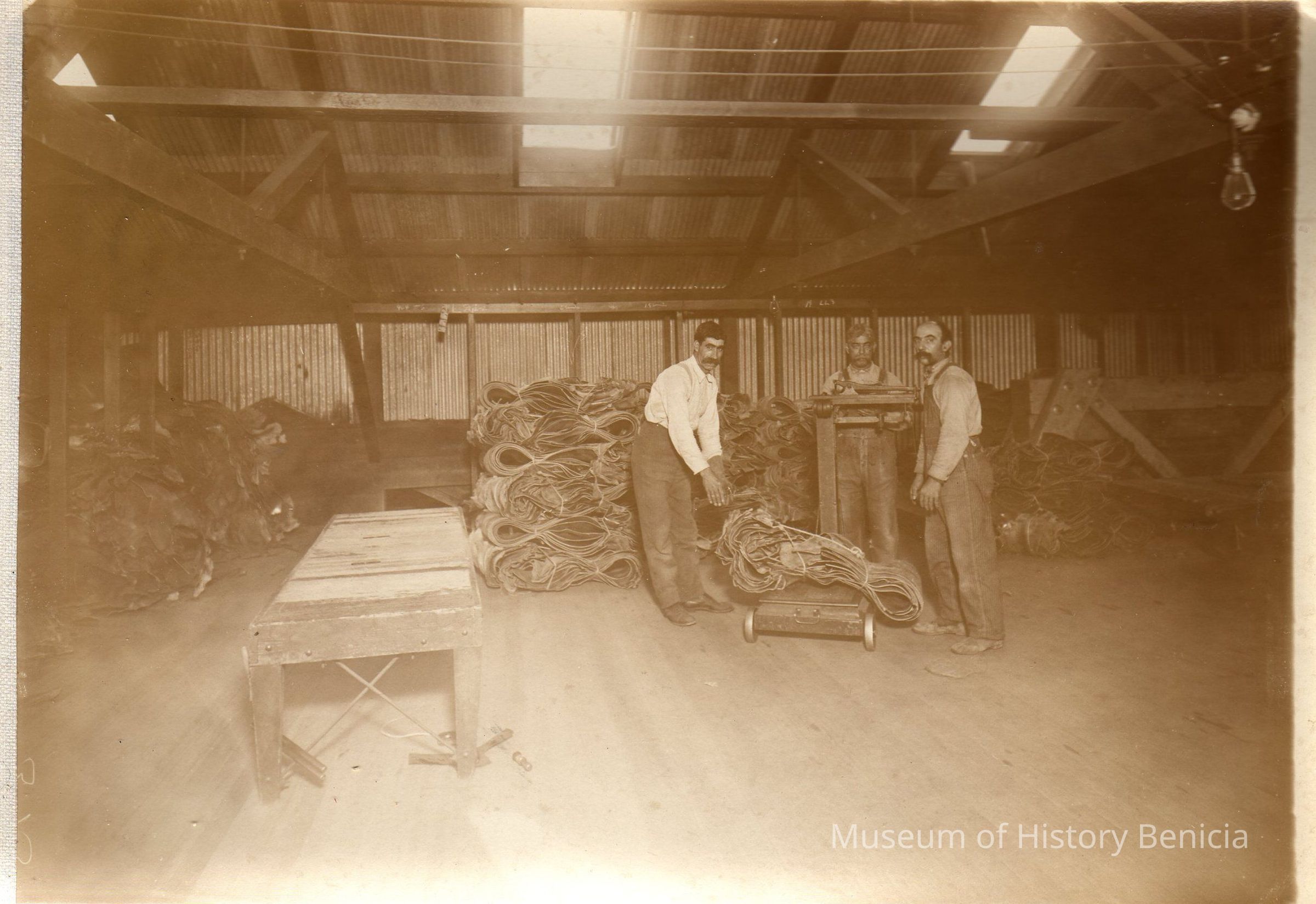 Sepia-tone photograph from an album: Kullman Salz Tannery workers weighing hides.
