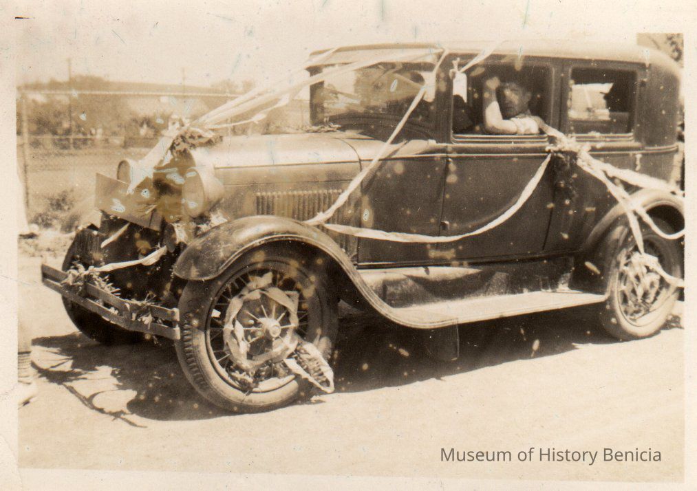 B/W photograph of Geo Borges sitting in the front seat of a car that is decorated with streamers.