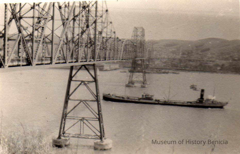 B/W photograph of the Dedication and Opening of Carquinez Bridge, 1927; a view of the bridge looking north with a cargo ship of some kind passing beneath it.