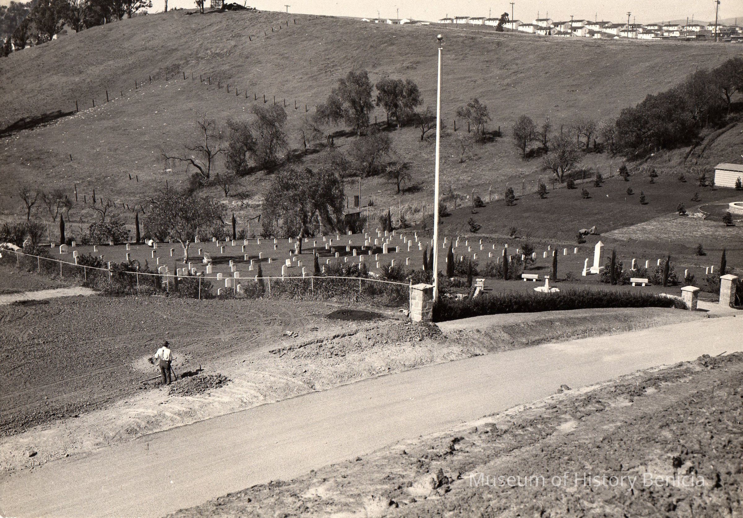 Cemetery addition on south side. Military housing in background. B/W photo.