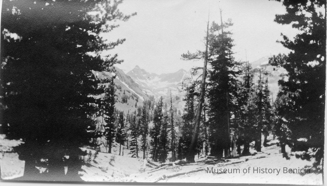 A photo of mountains and trees. On the back it says "Near Coyote Gap Tuolumme Co July, 1921"".