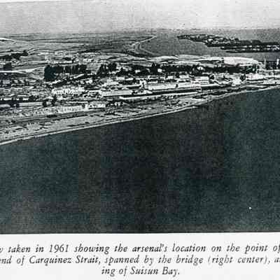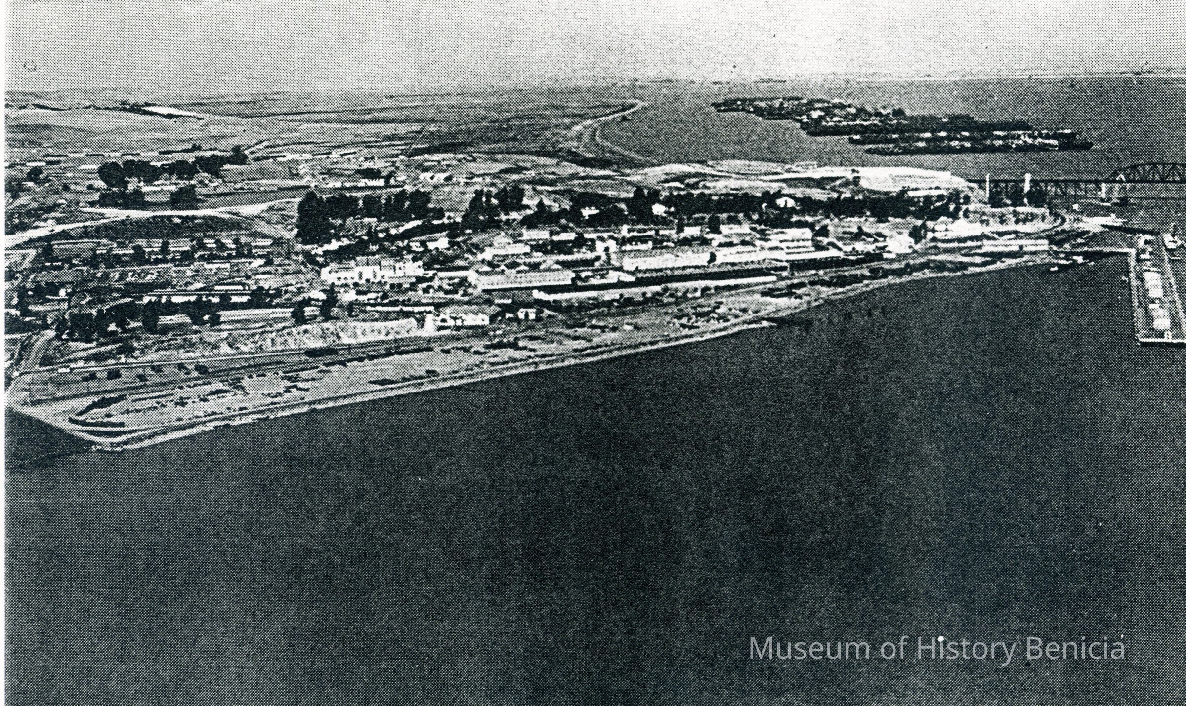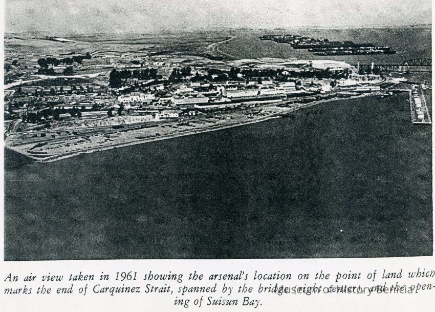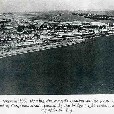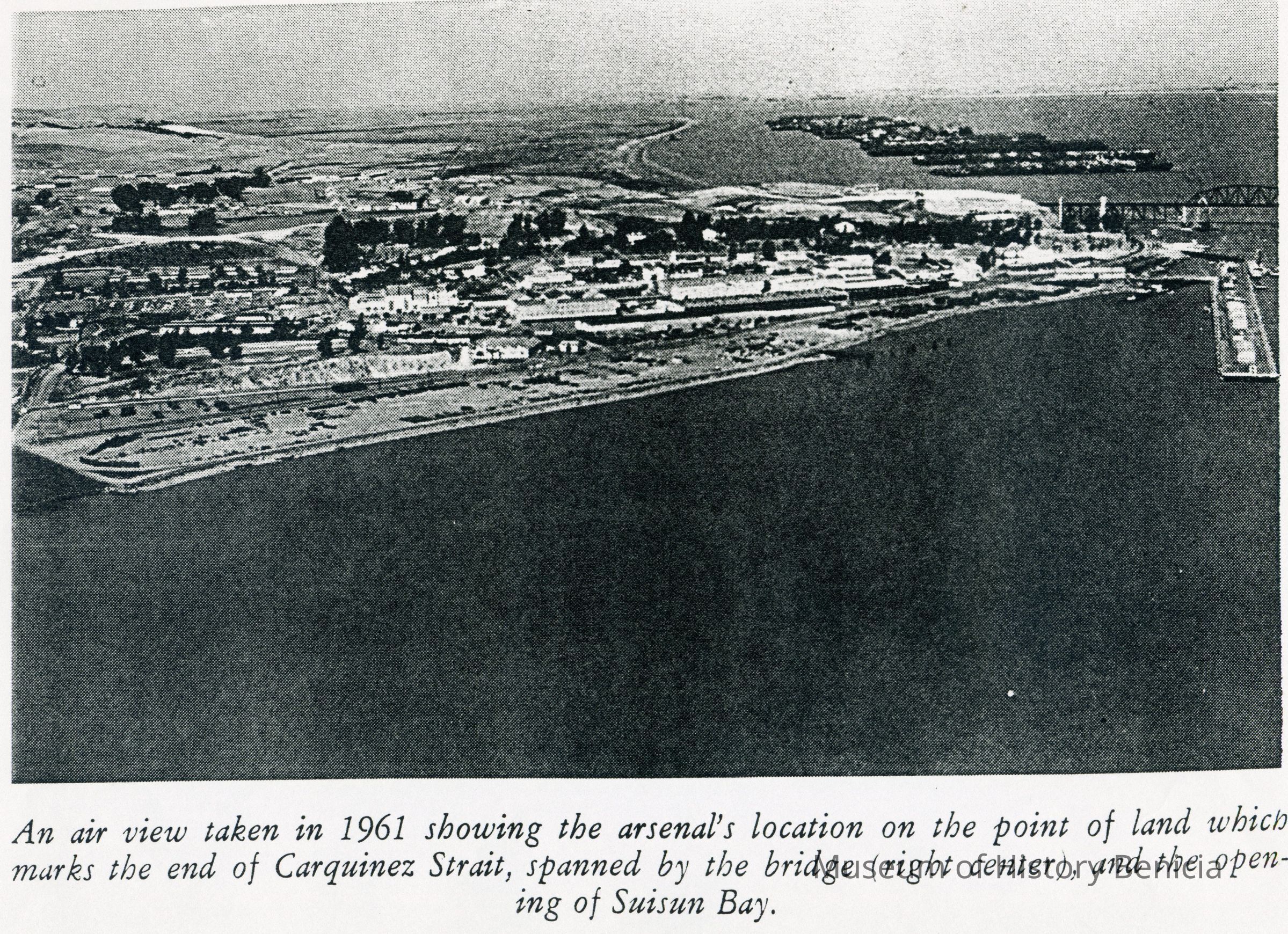 Black and white photocopy of an original photograph located at the Benicia Arsenal: Aerial view was taken in 1961 showing the Arsenal's location on the point of land at the end of the Carquinez Strait. Also visible are the Benicia Bridge and the opening of Suisun Bay.Collection