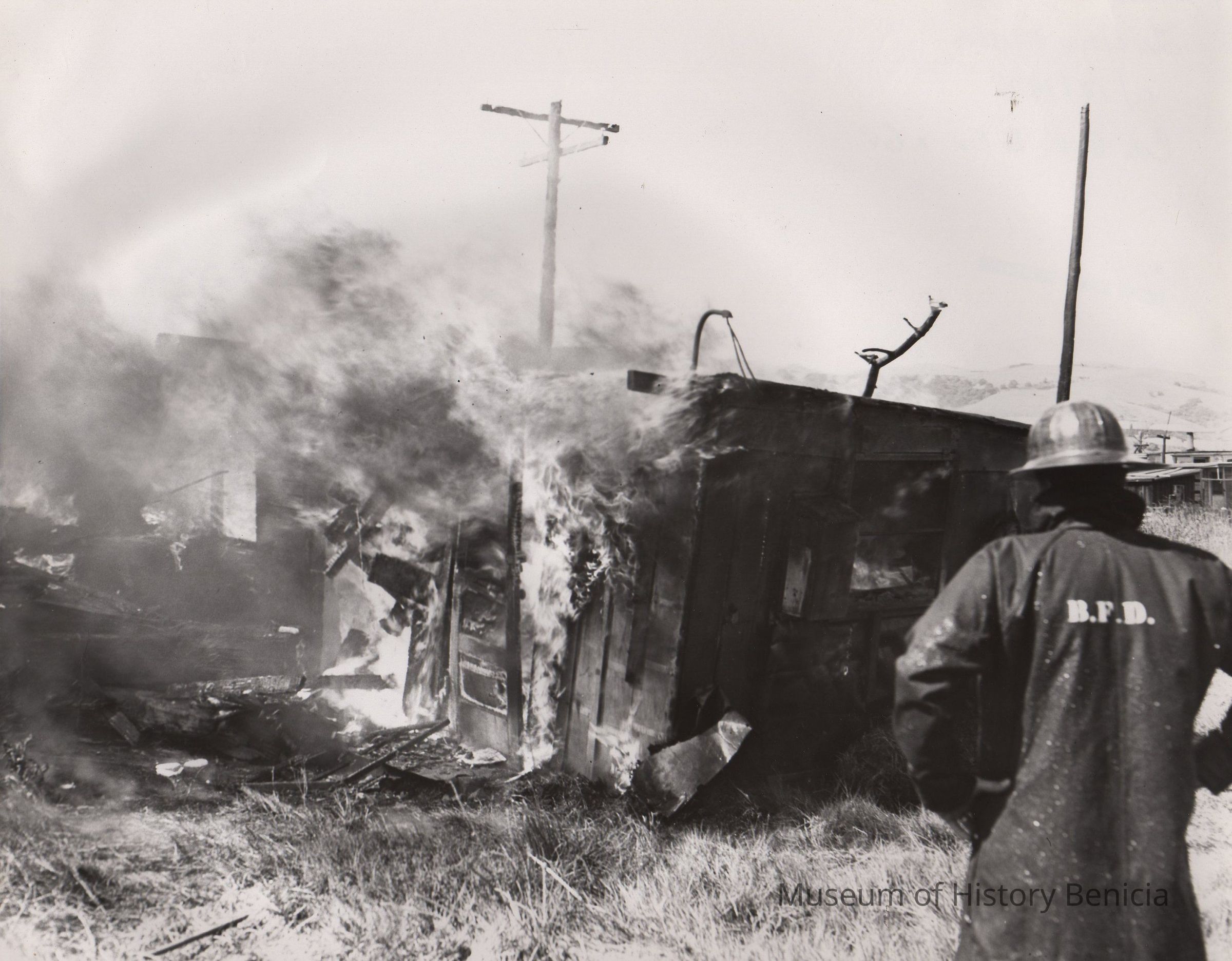 This is one of a set of five photographs which are most likely depicting a fire department exercise in burning down an old building.Collection