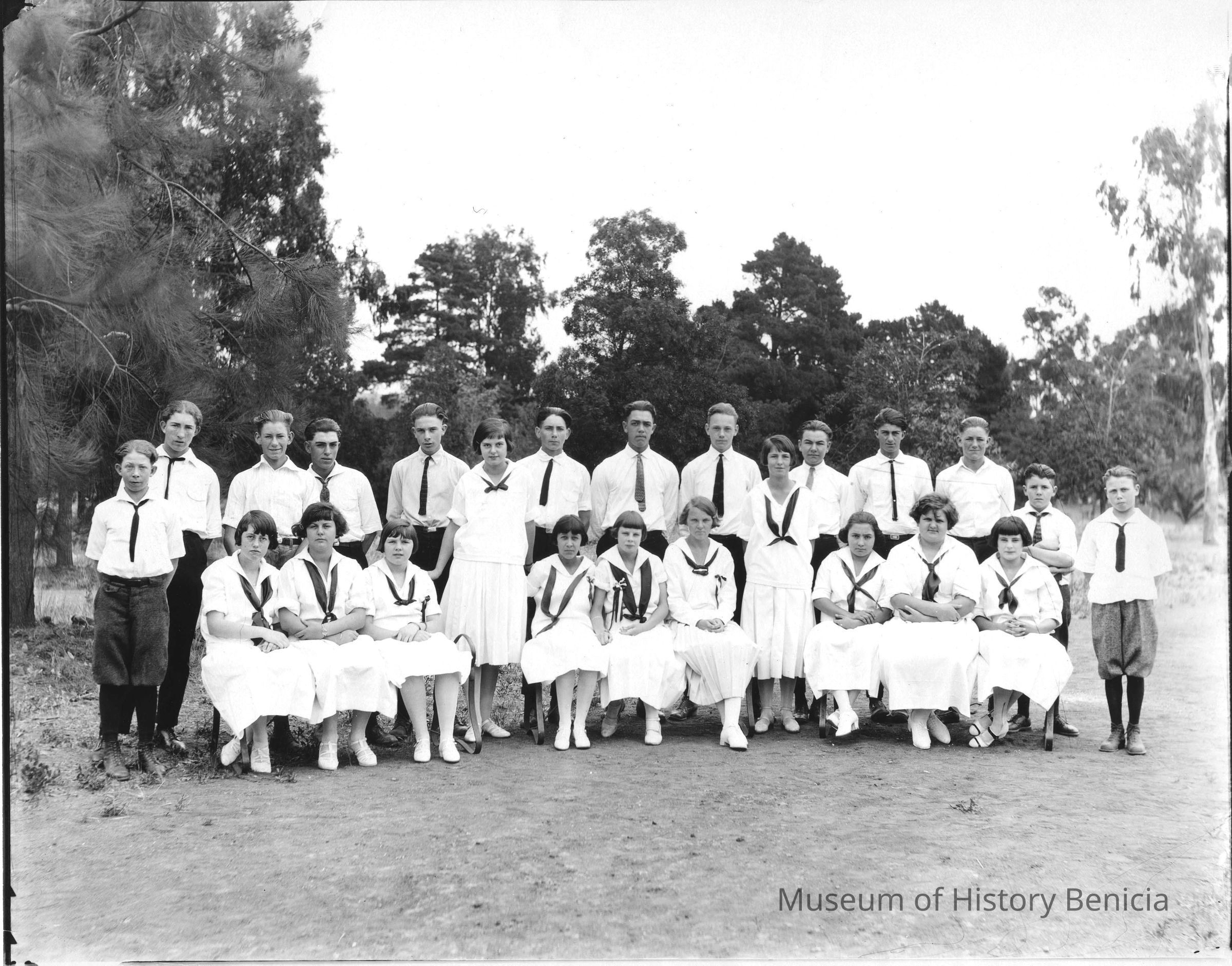 Photo of group of kids sitting and standing in two rows. Looks like a graduating class. The girls are in uniform.