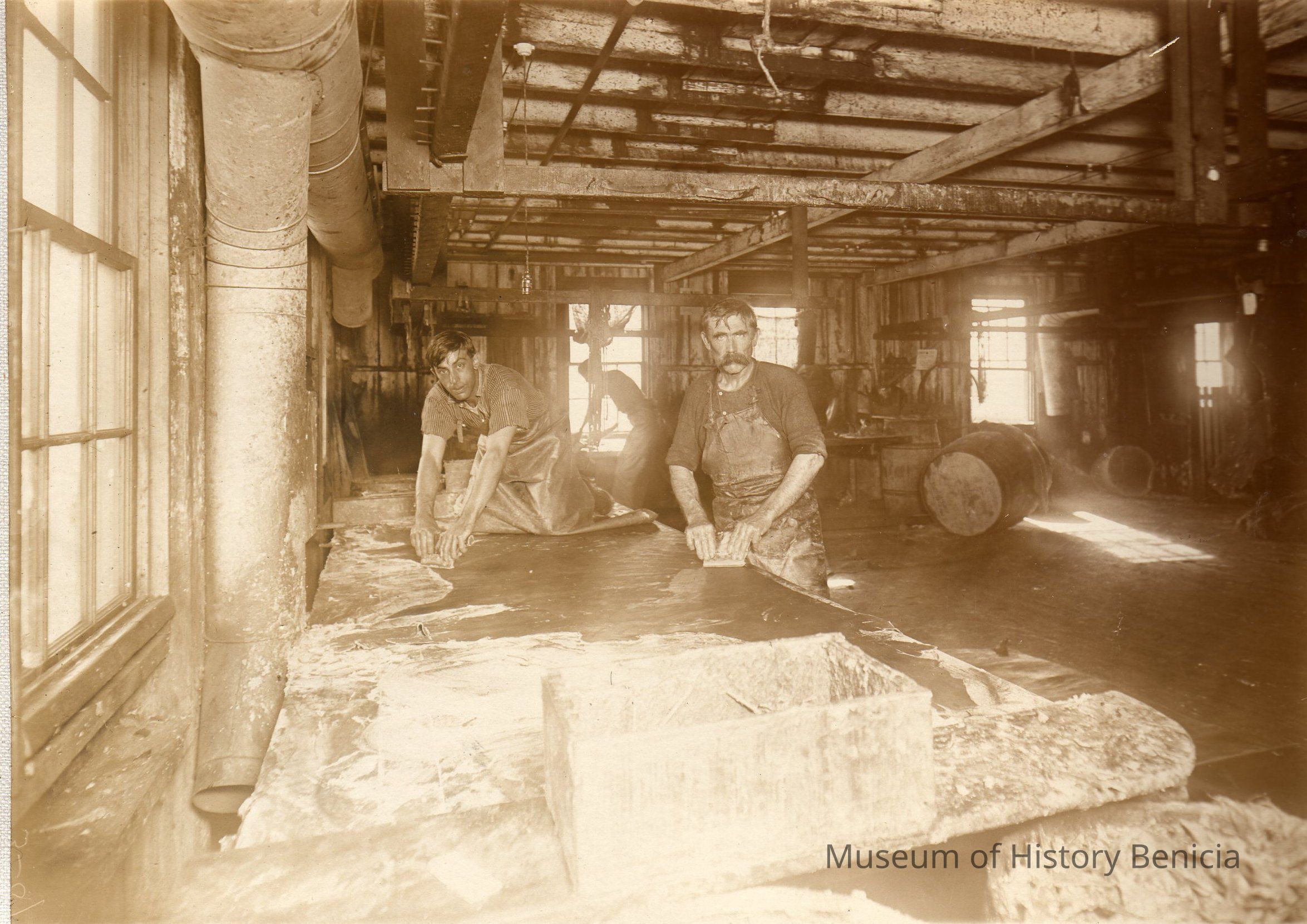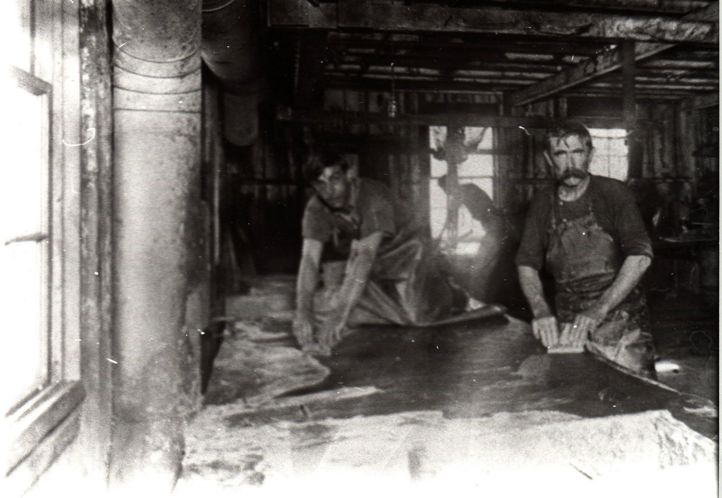 Sepia-tone photograph from an album: Kullman Salz Tannery workers dressing down tan hides.