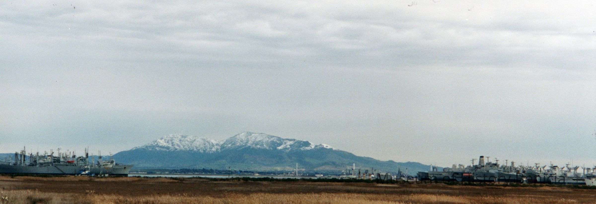 Color photograph. Panoramic view of the mothball fleet with a snow capped Mt. Diablo