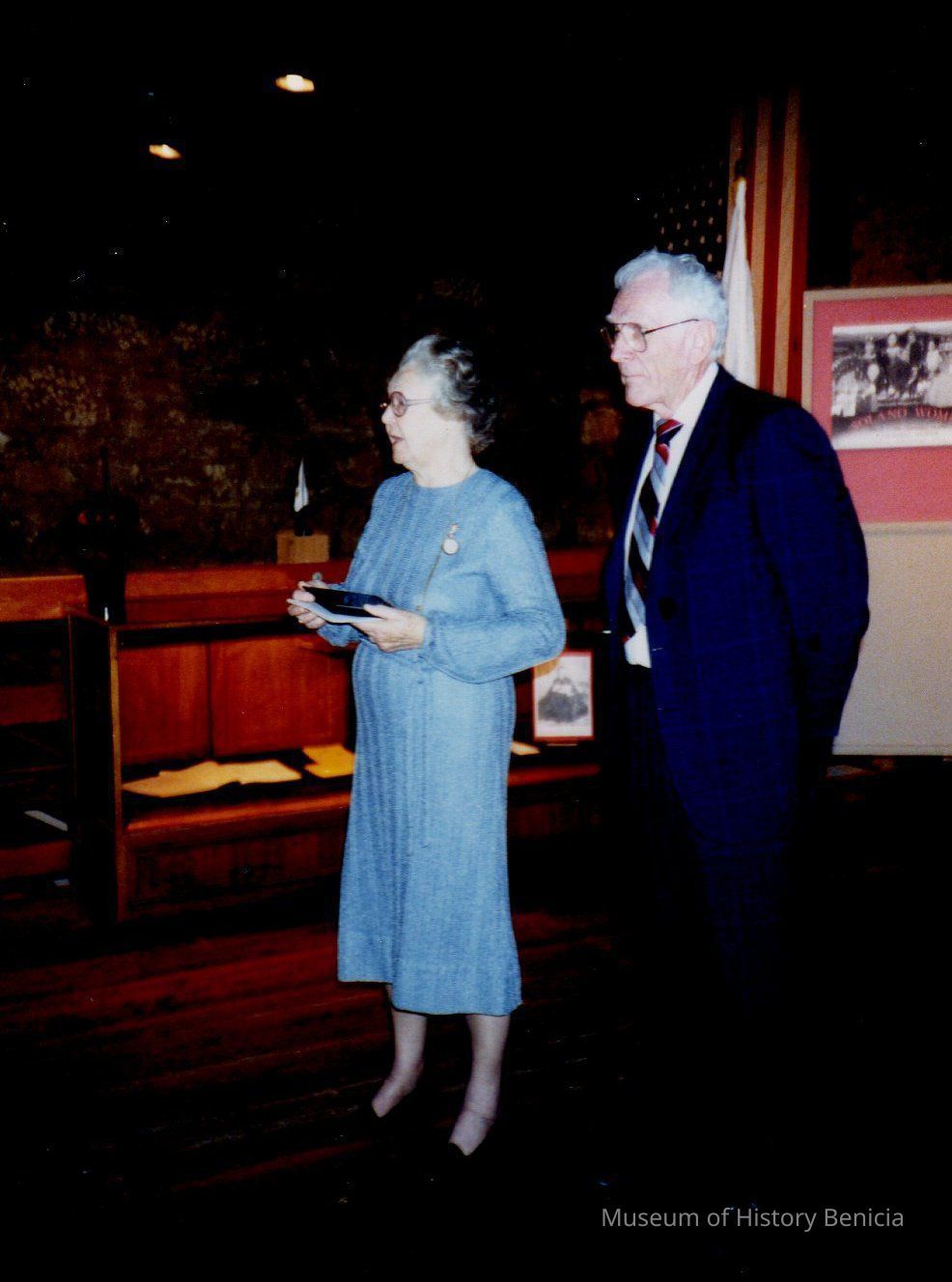 Color photograph of ceremony at Camel Barn Museum. Shown from L-R are Gladys Wold, and Harry Wassmann.