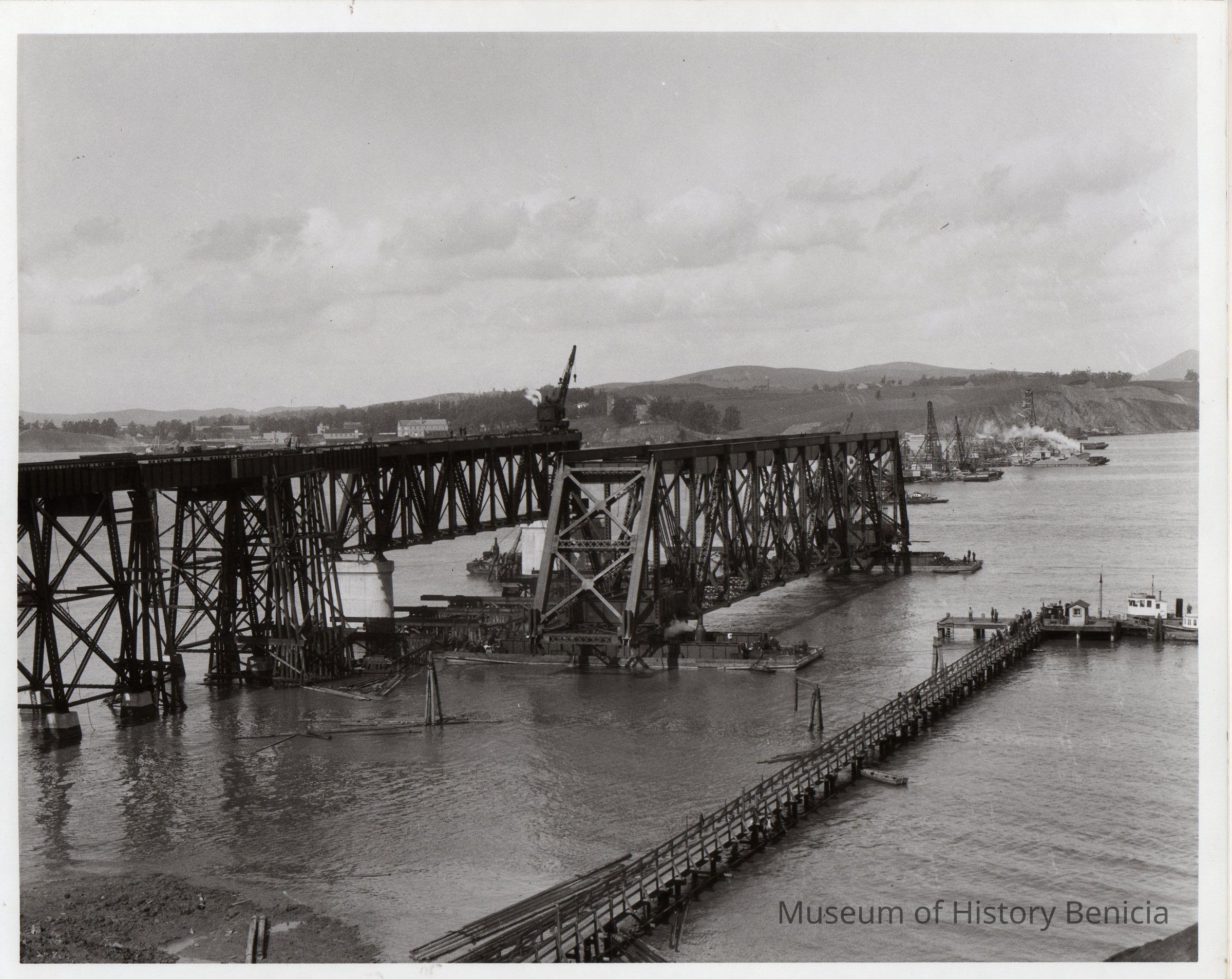 B/W Photograph: Benicia-Martinez rail bridge under construction. Benicia is in the background.