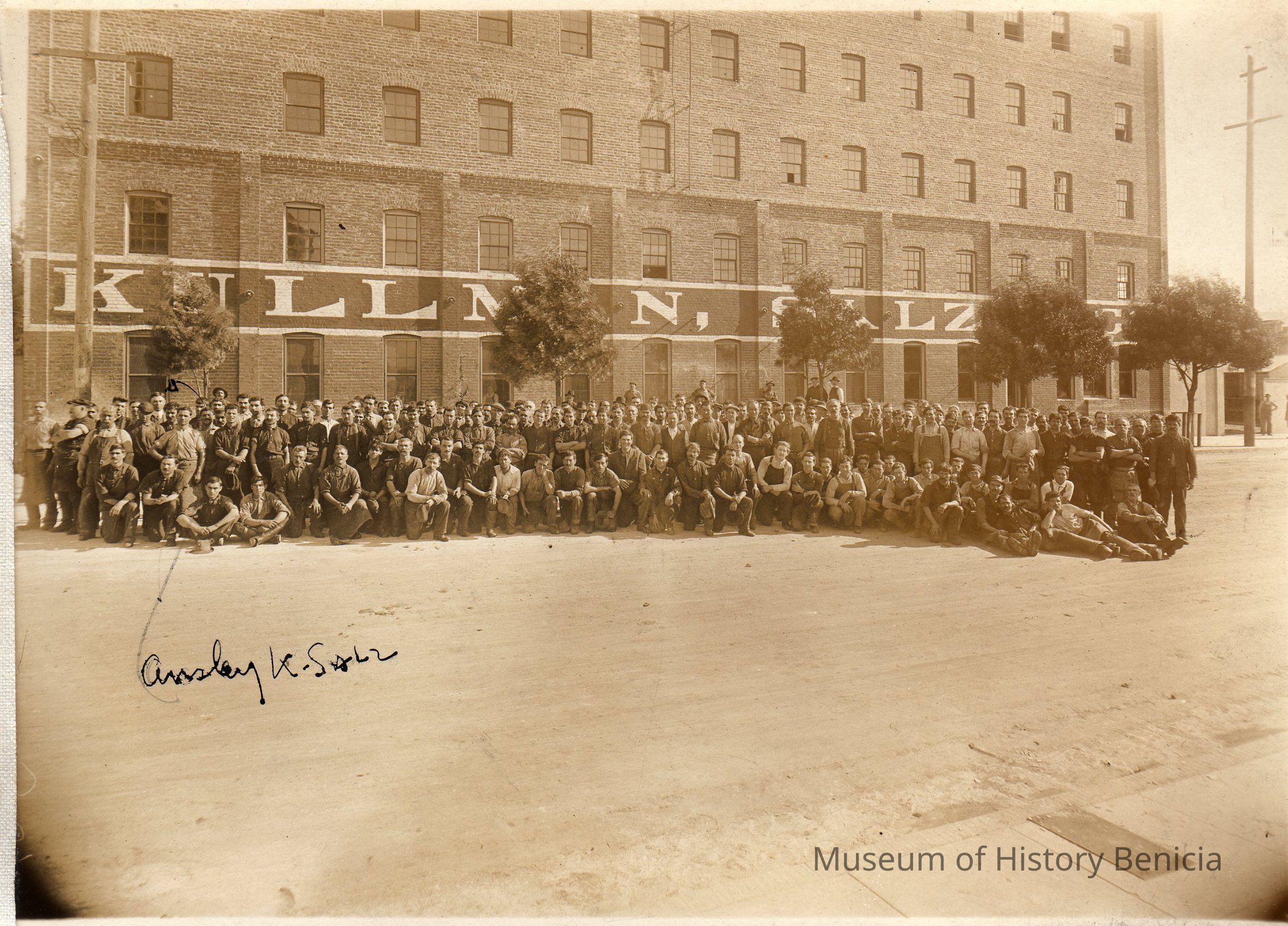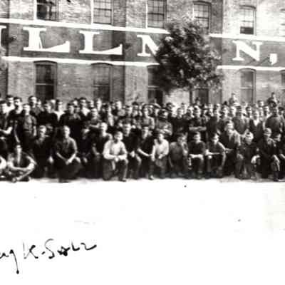 Sepia-tone photograph from an album: Tannery workers of Kullman Salz Tannery.
