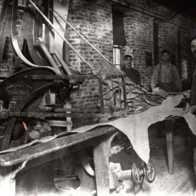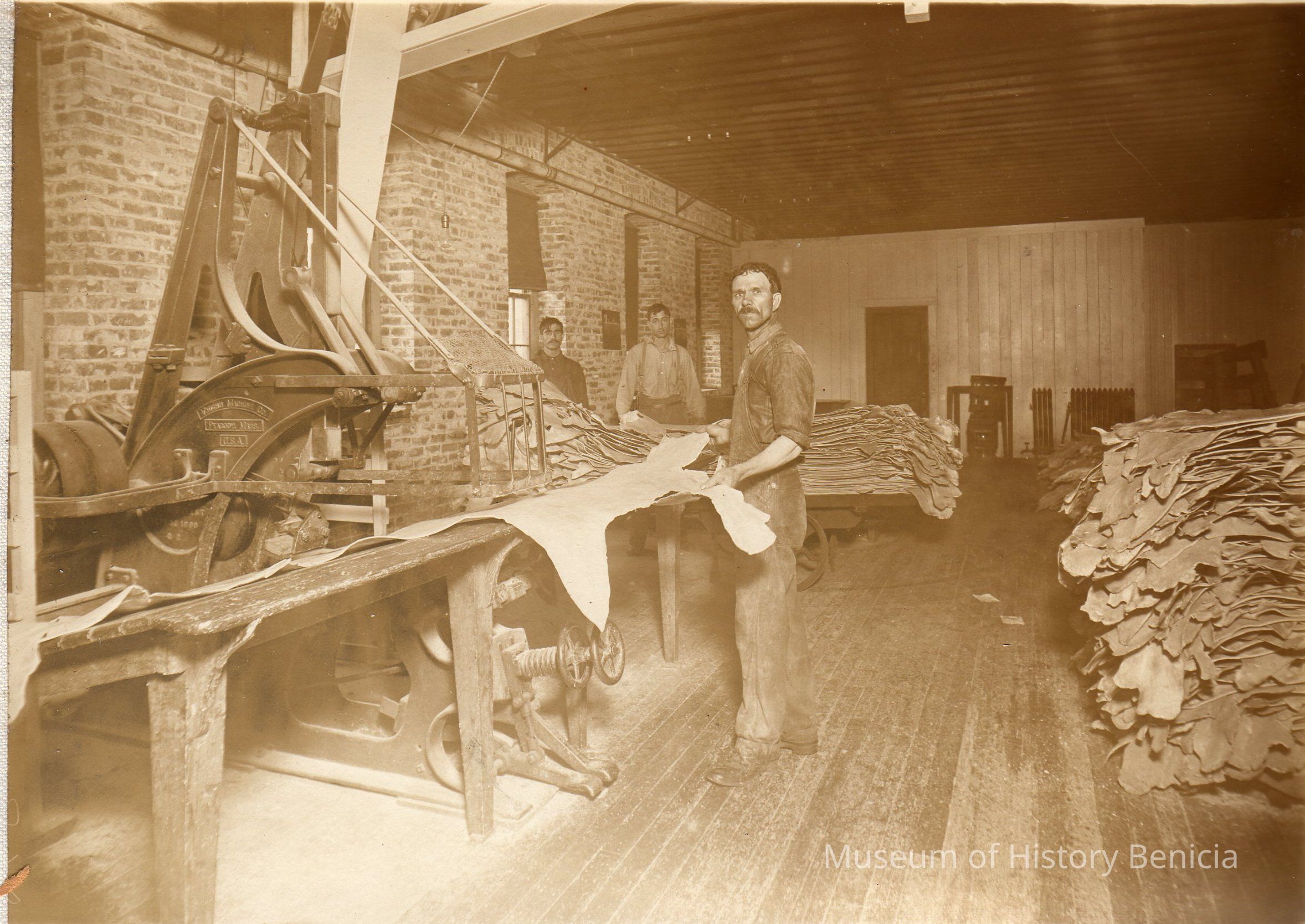 Sepia-tone photograph from an album: Workers in the cutting room at Kullman Salz Tannery.