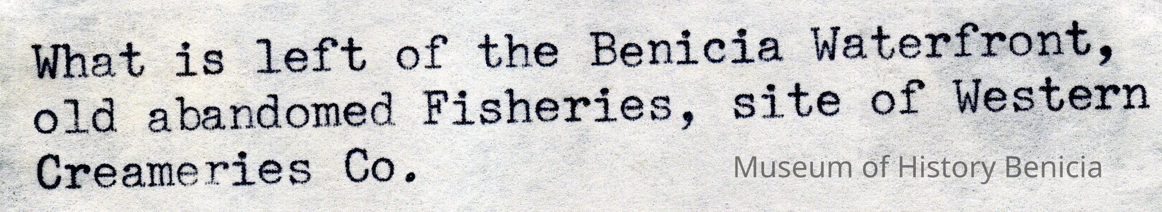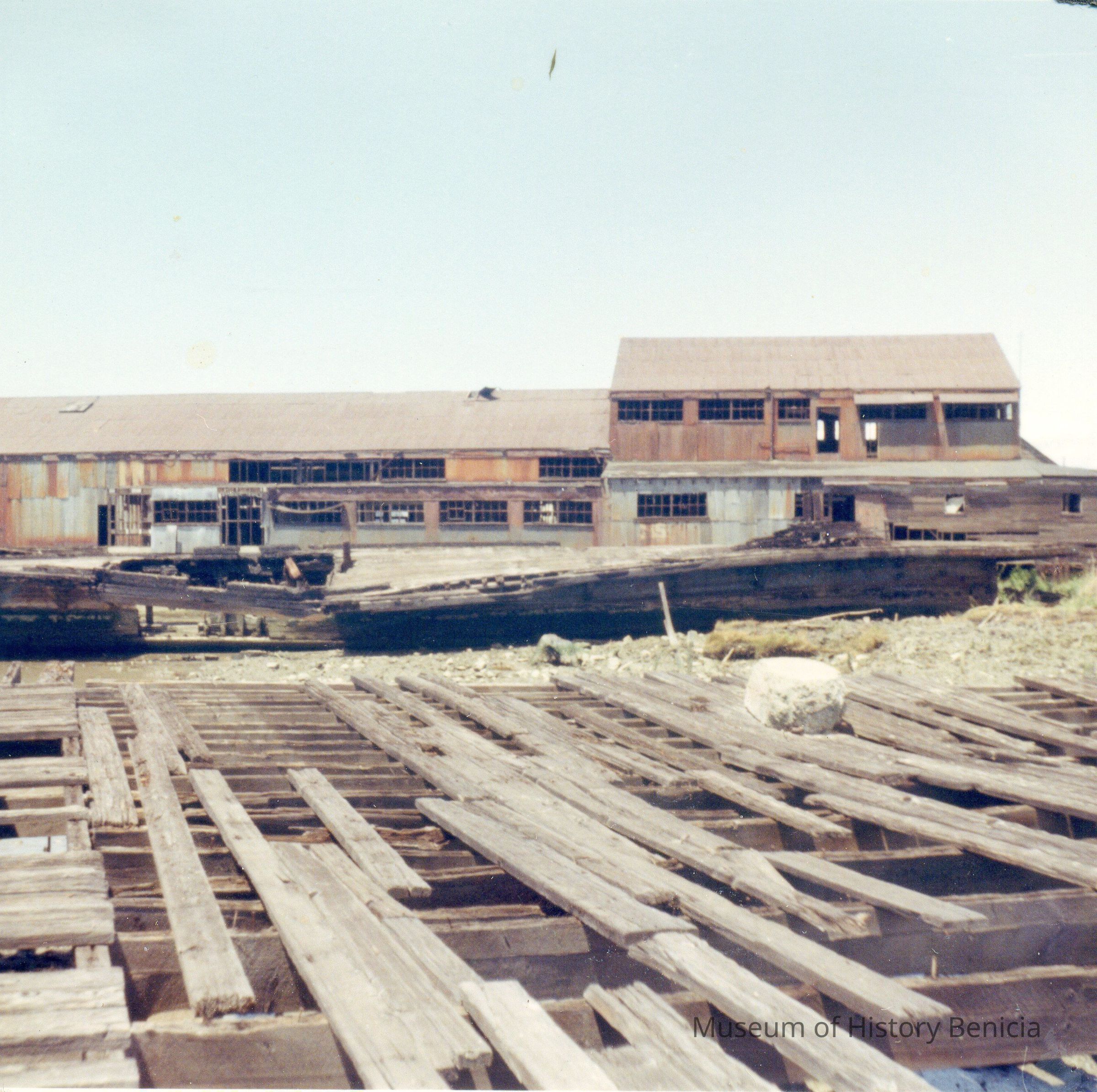 Color photograph buildings on Benicia waterfront probably about 1969. Caption says this is the site of the old Fisheries building and Western Creamery.Collection