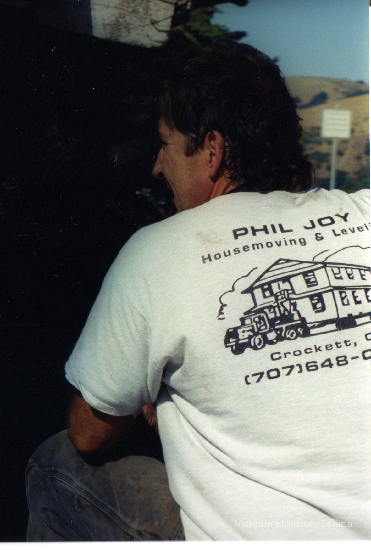 Color photo of a worker taking a break from working on the Lido. The back of his shirt is an advertisement for the company.