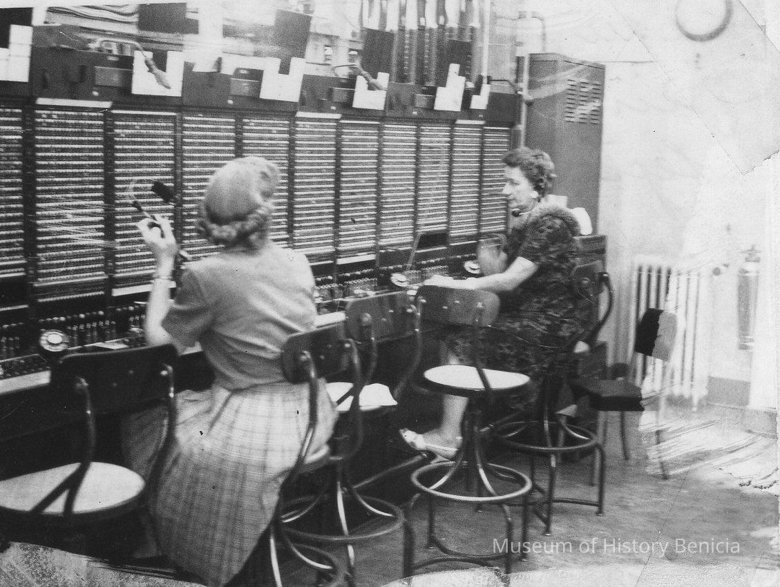 B/W photograph: two women seated at switchboard. On back in ink "Cut over to dial in Benicia 12:01AM Sept 9, 1962. Dolores Griffith (left) Fanny Carden 1962Collection