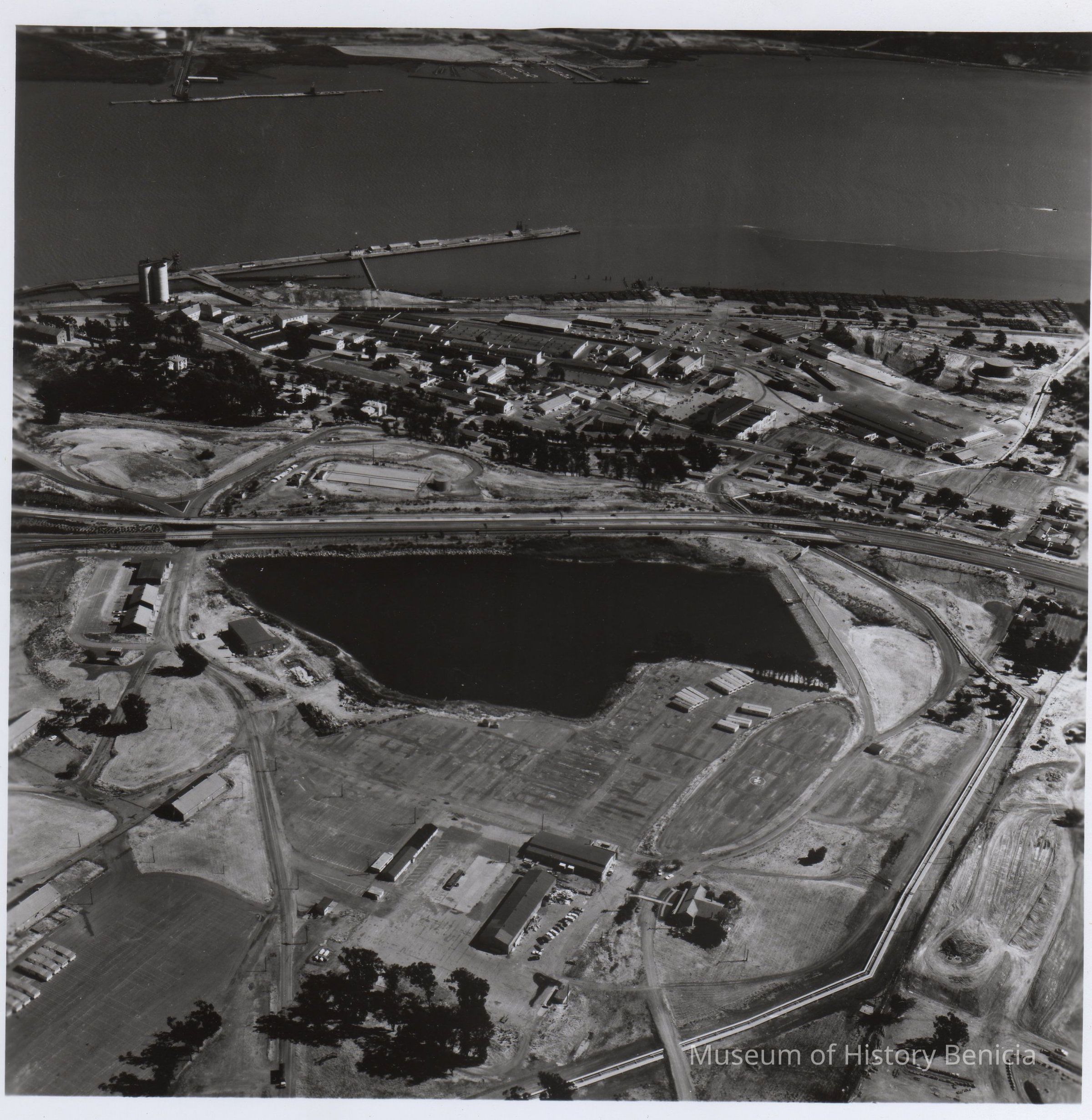 Aerial view looking south across Benicia, towards Industrial Park, docks and bridges. B/W photo.