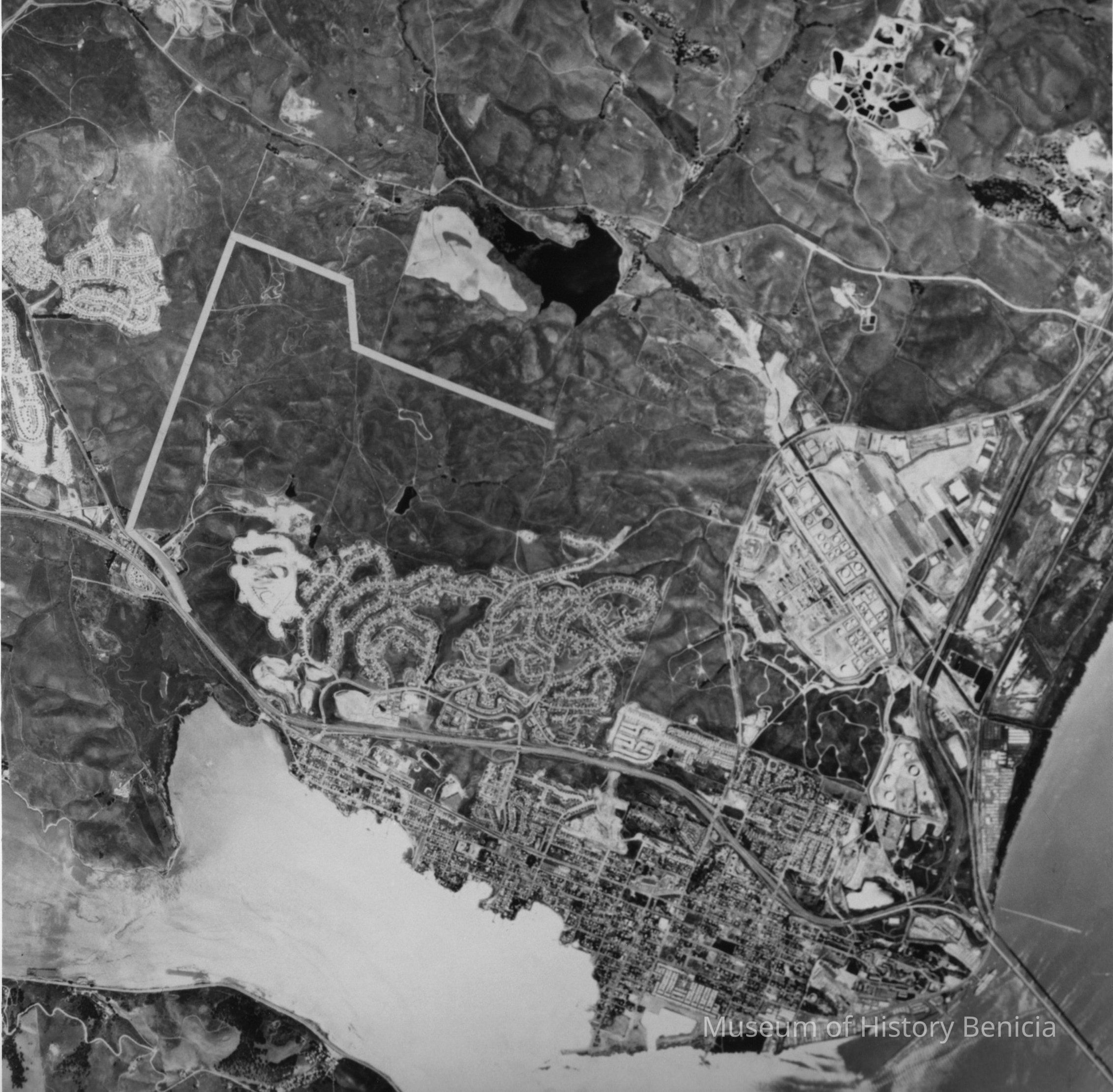B/W aerial photograph of Benicia in May 1980 according to label on back of photo. Identical to object ID: 2002.013.0033.