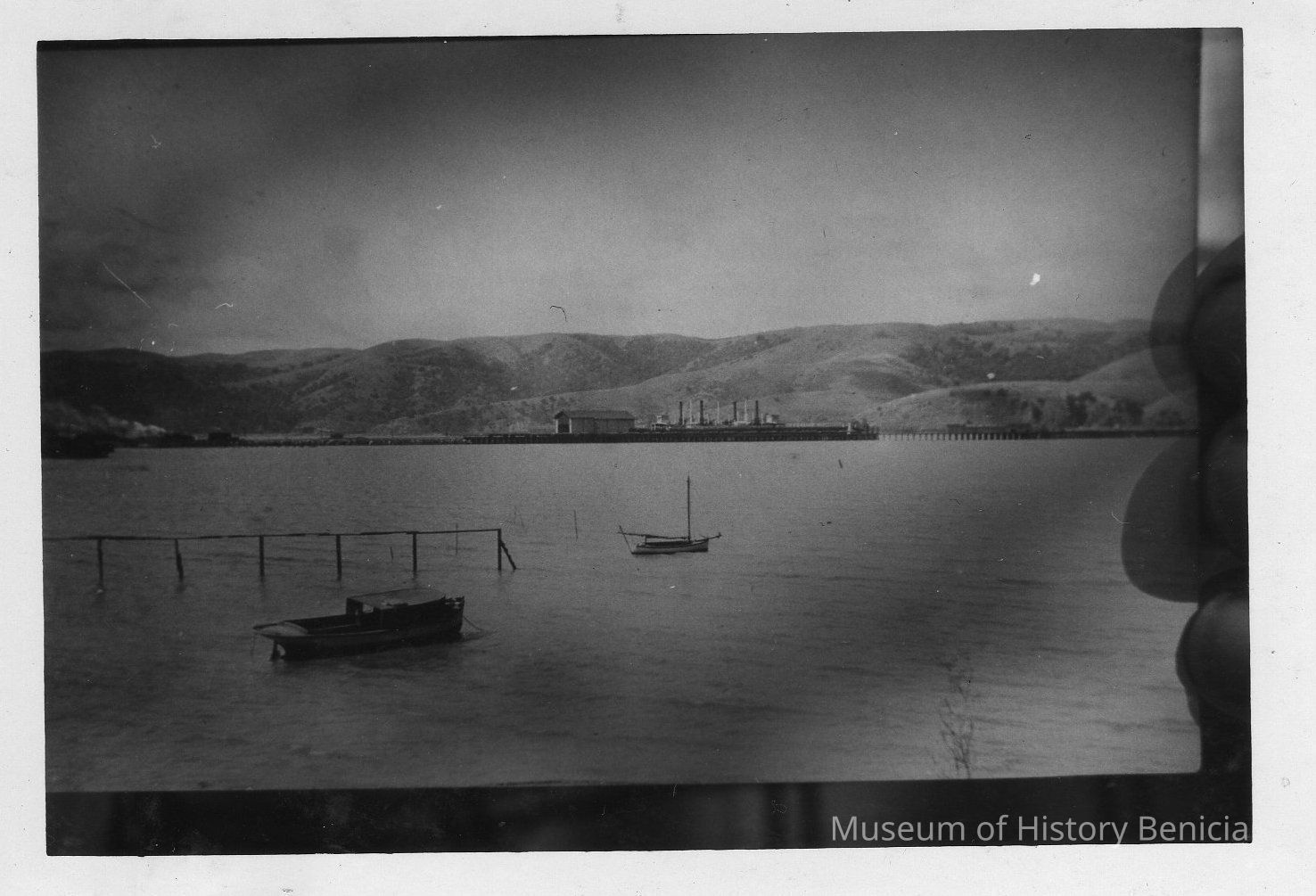 B/W photograph of an old photograph: shows waterfront at West 4th and I Streets (McKay Cove); the Ferry Solano can be seen in the background at the ferry landing at the foot of 1st Street.