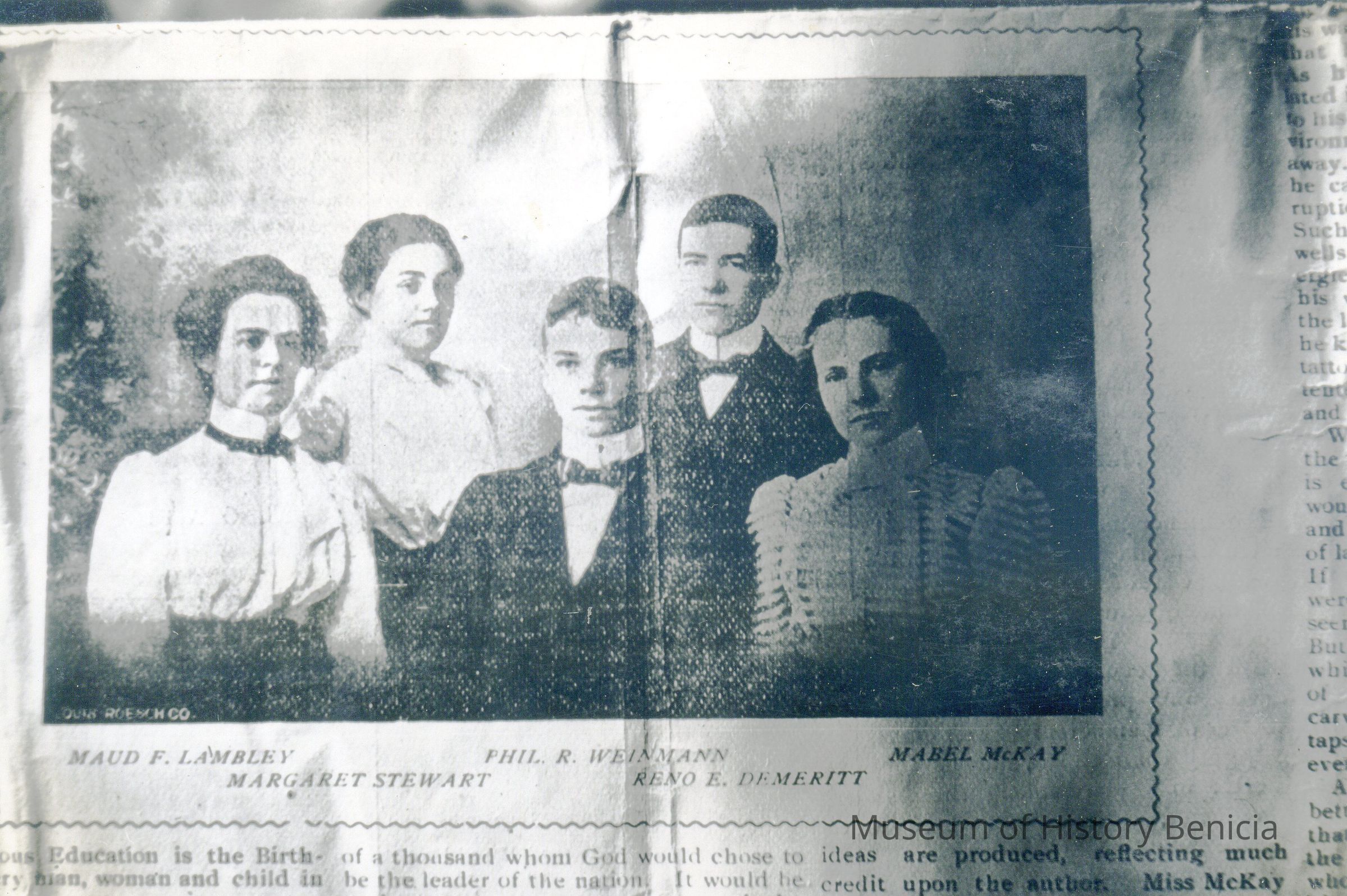 B/W photograph from a newspaper of the first graduation class of Benicia High School. The graduates in 1899 were: