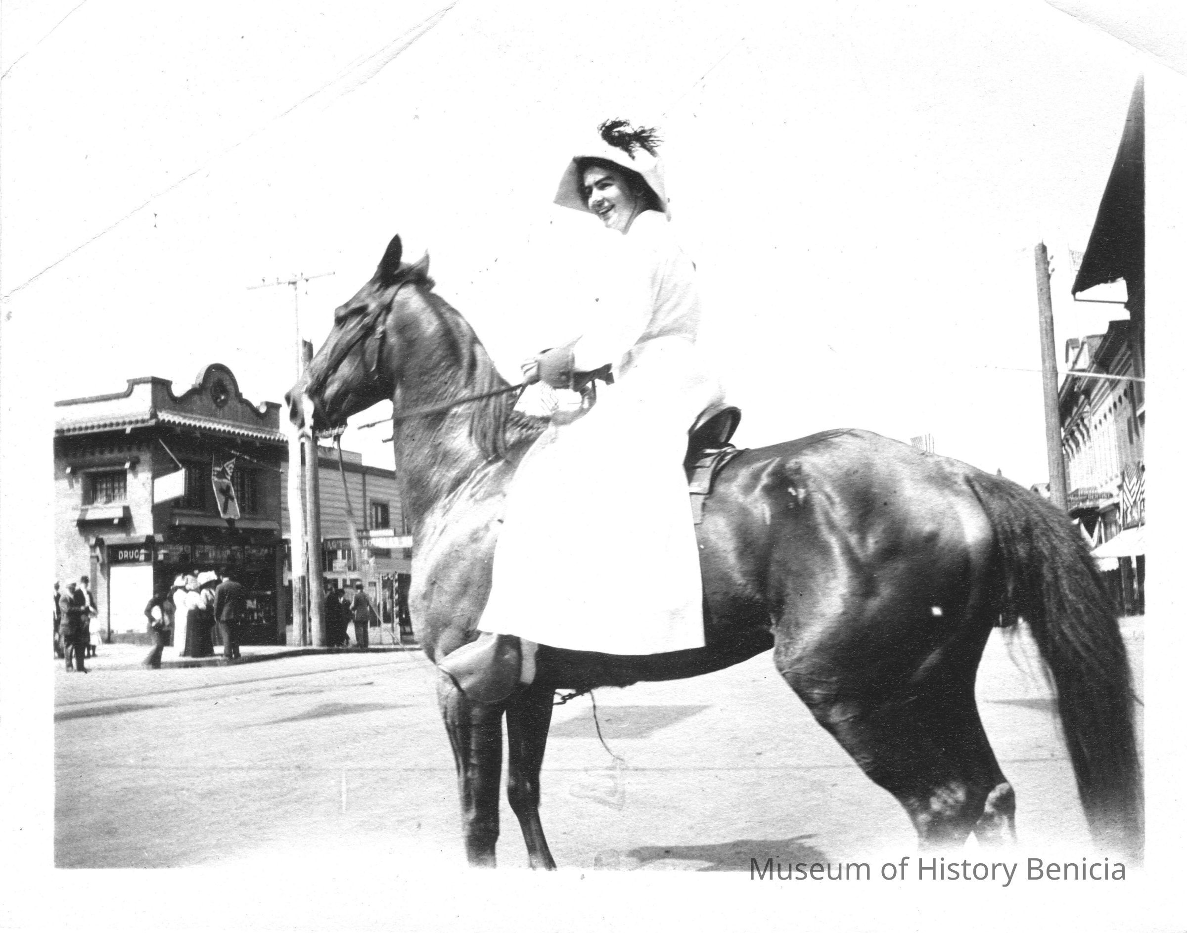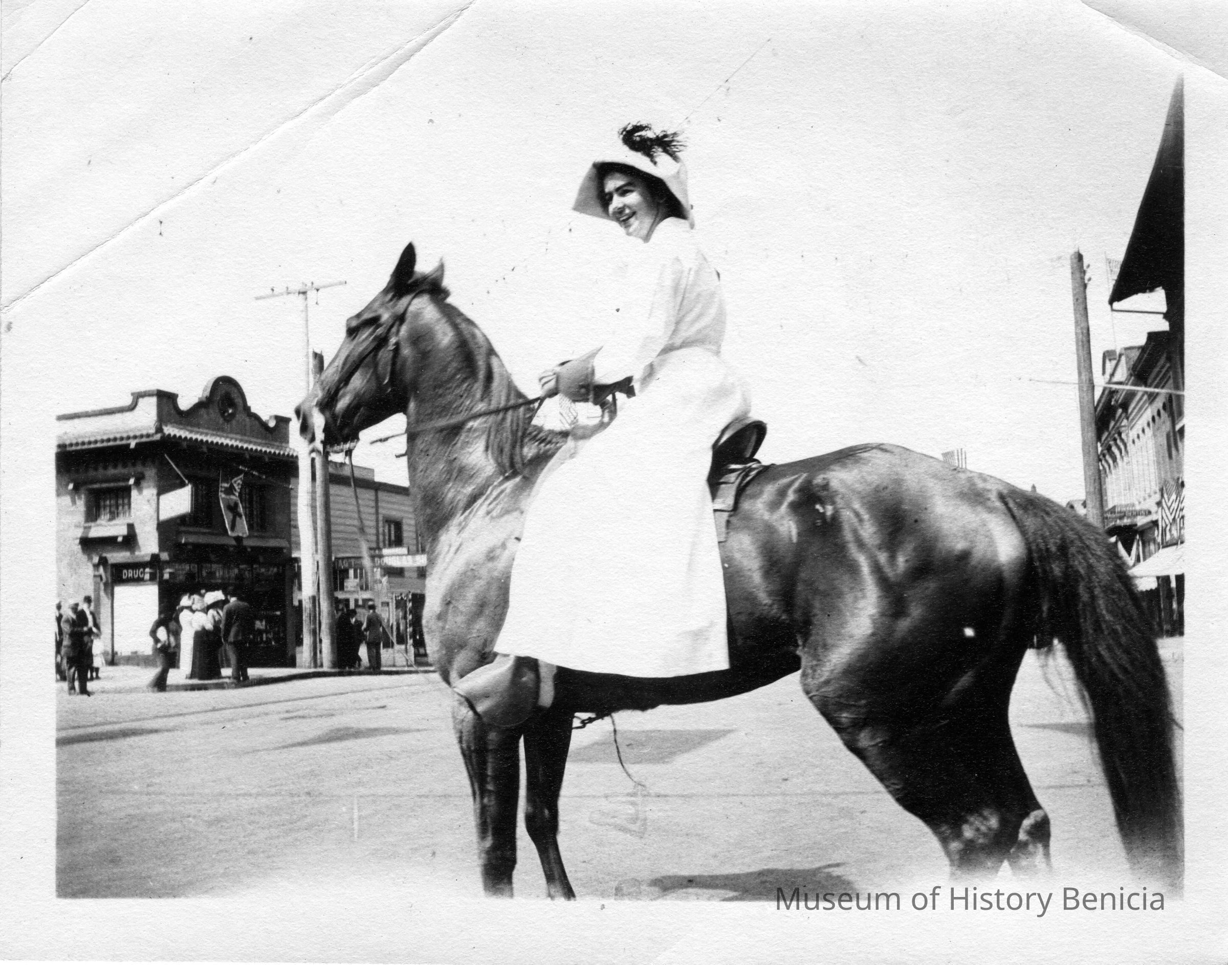 Photo of a woman in a bonnet on a horse. They are downtown across from a drug store. There are banners on the storefronts so it may be the start of a parade or other celebration.Collection