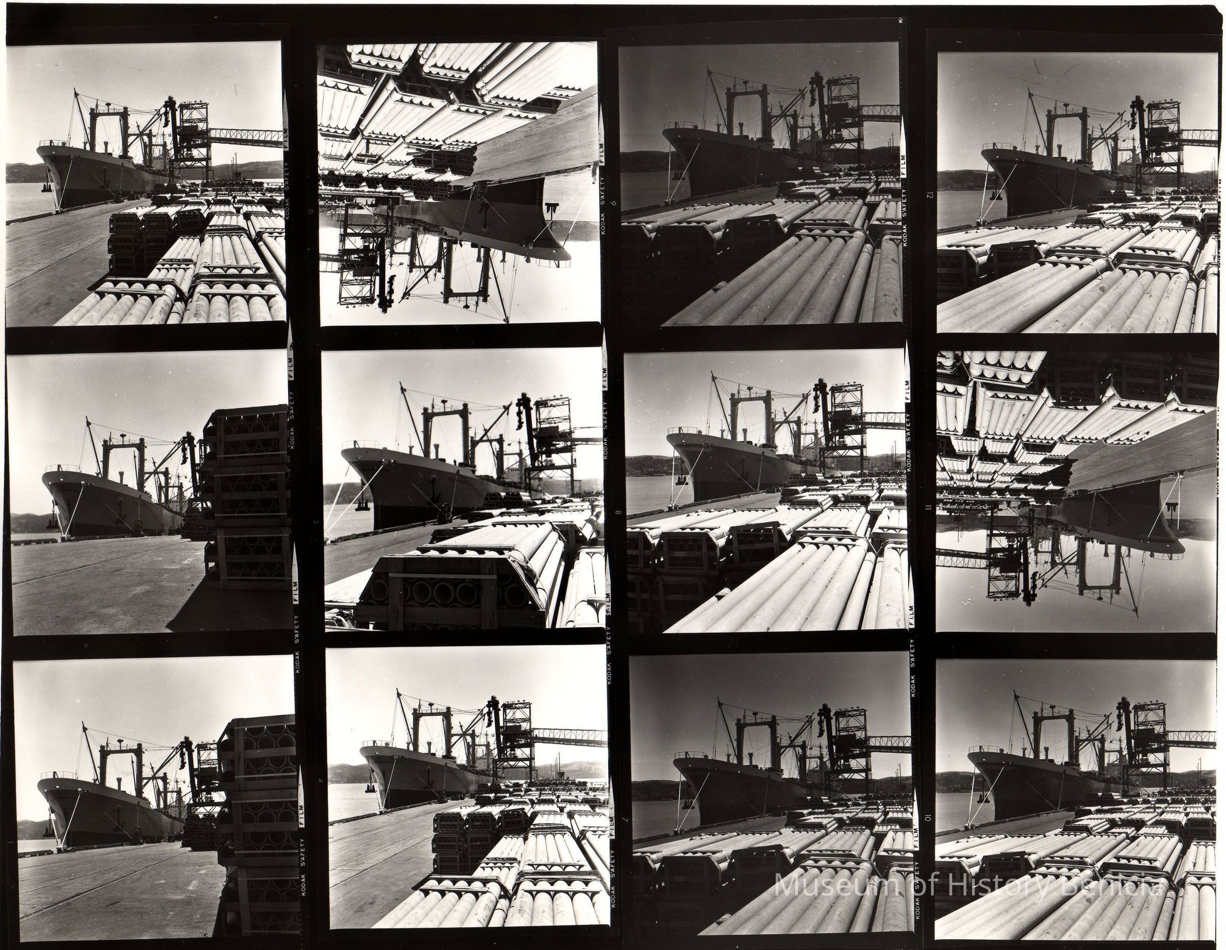 B/W photograph: 12 shots (proof sheet) of Cargo ship "Pacific Prince" at Loading dock - Port of Benicia Groups of pipes on loading dock Some shots alike. 1973Collection